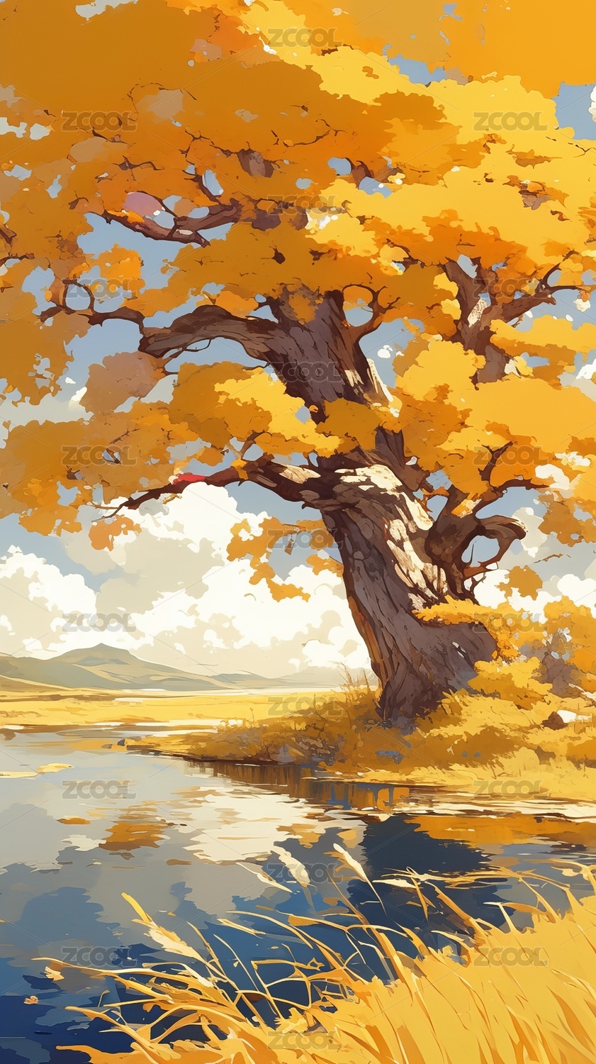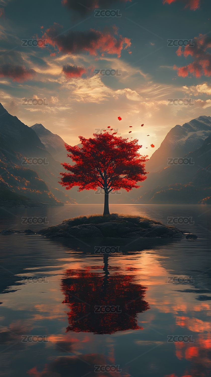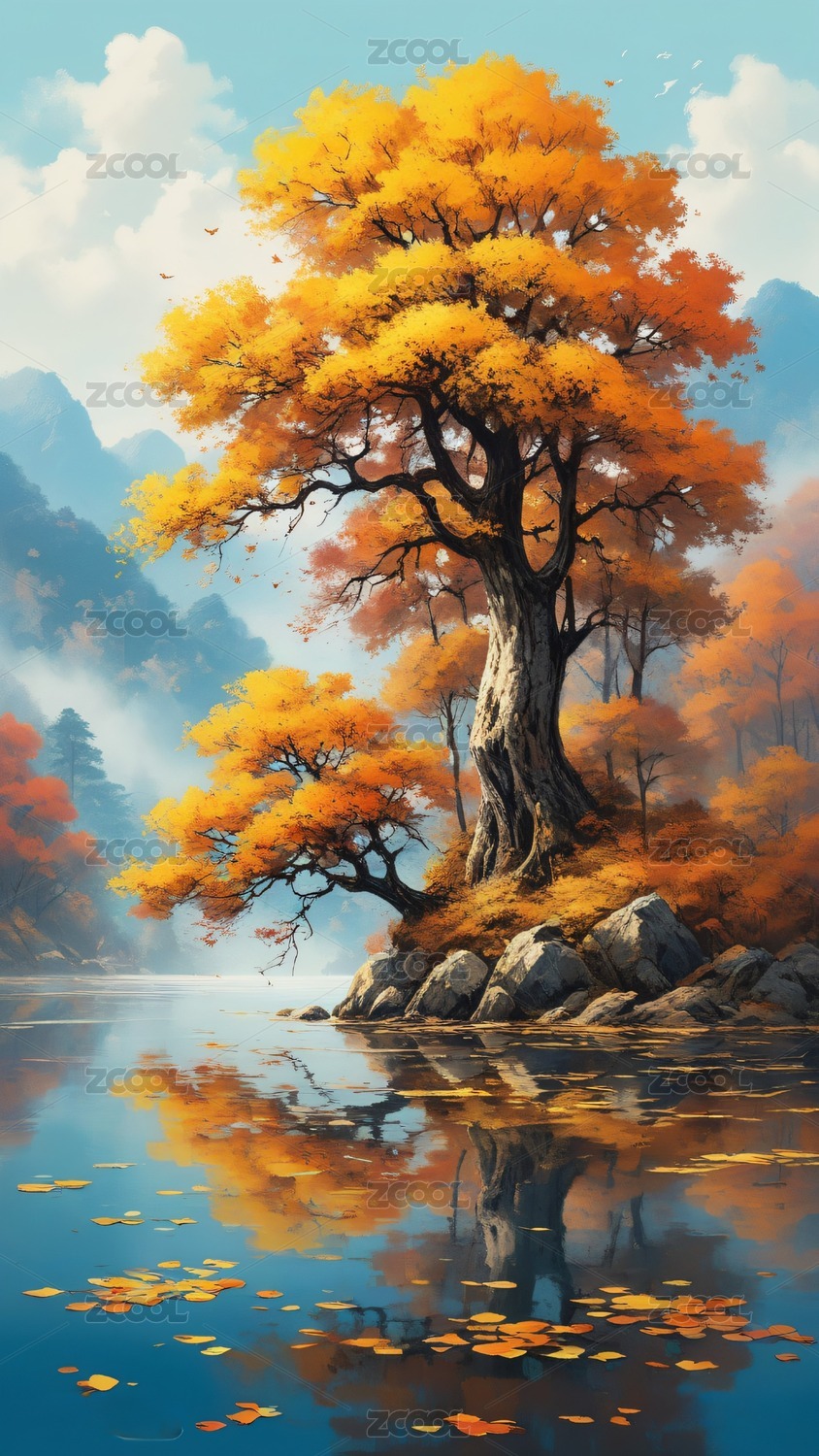 AIGC202402,秋日,秋天,节气,秋分,宁静,湖面,倒影,山峦