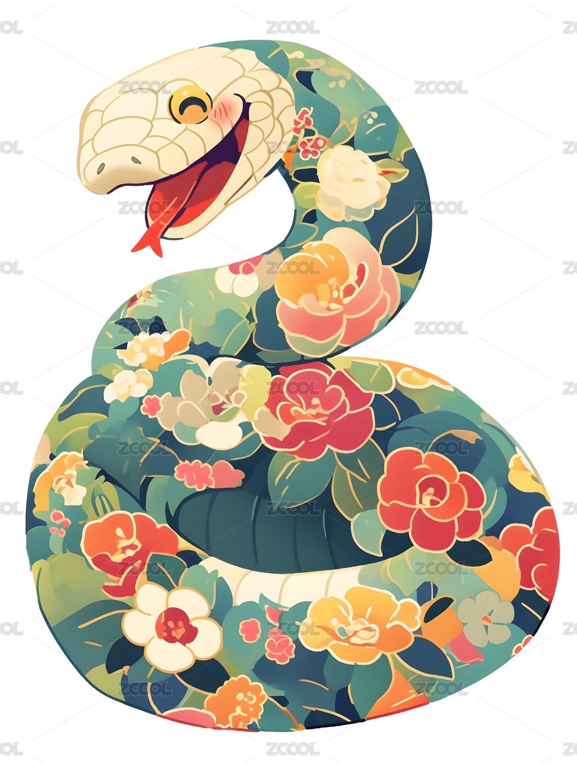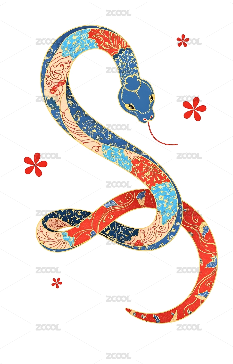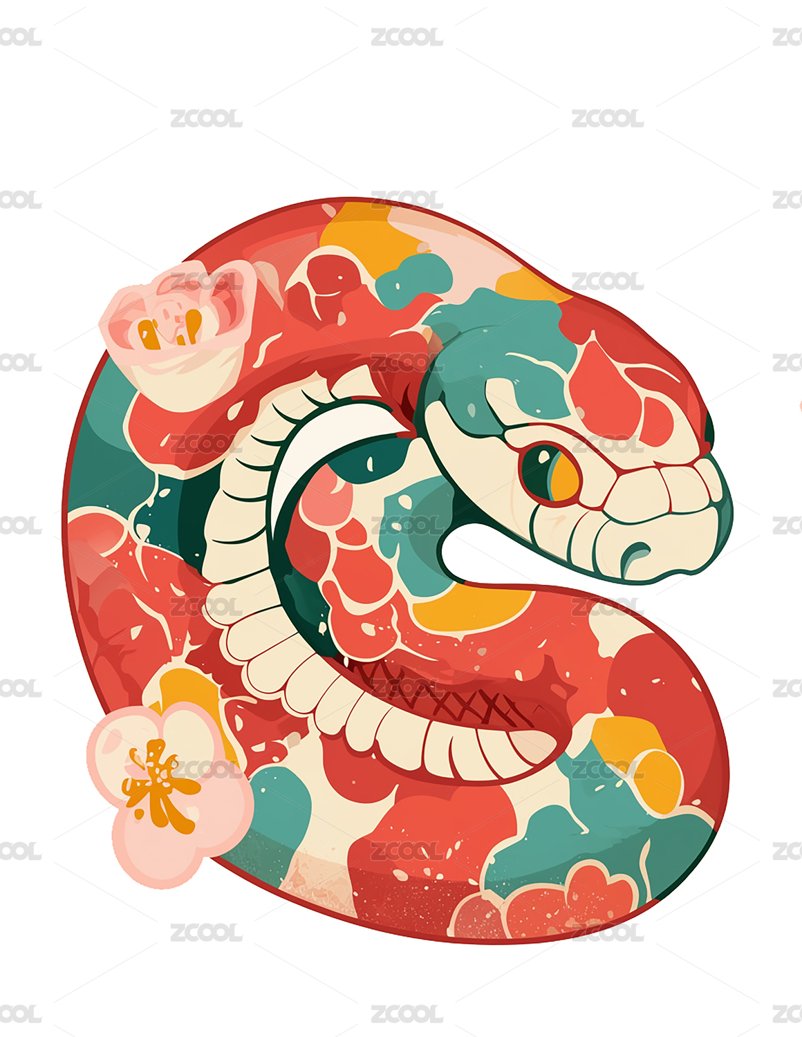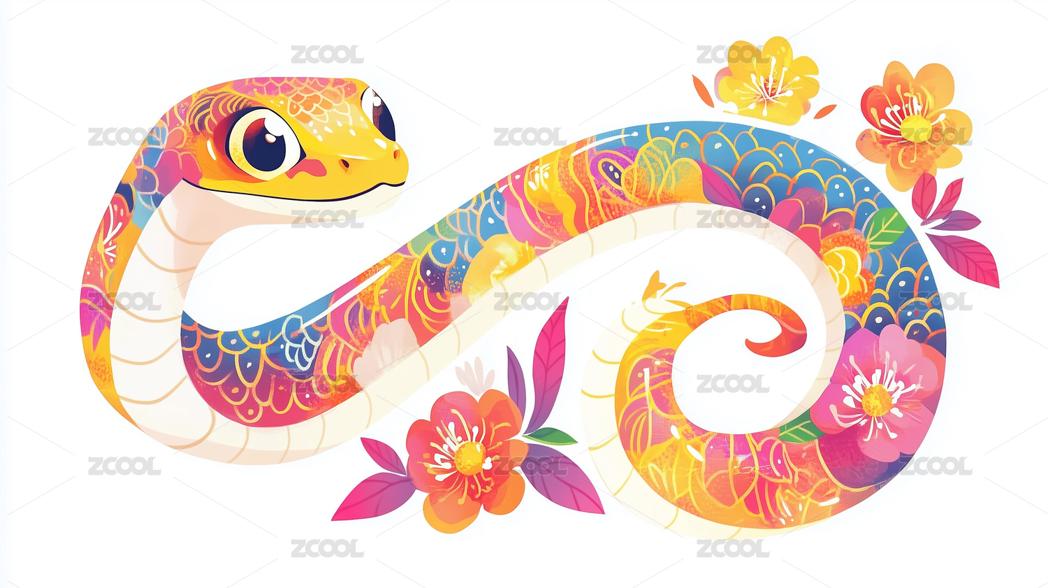 喜庆的复古风格五彩斑斓的蛇和花朵