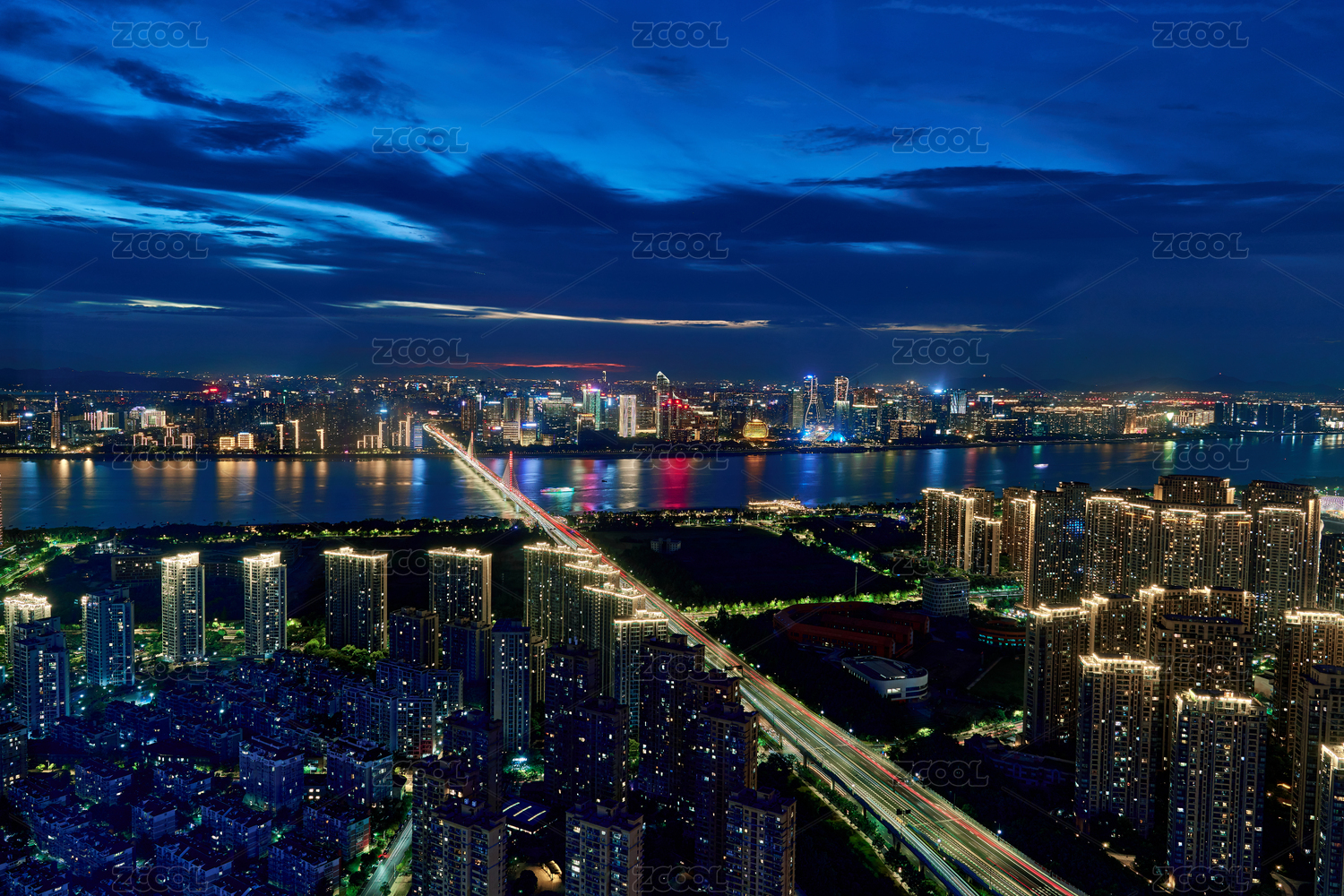 中国福建省福州市夜晚城区闽江外滩高楼建筑环境景观