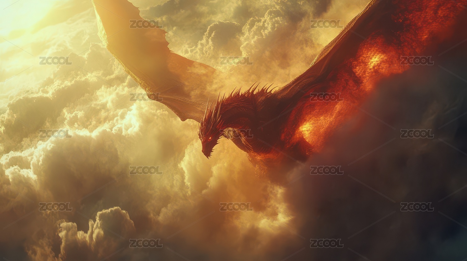火焰龙腾飞于云间的奇幻场景