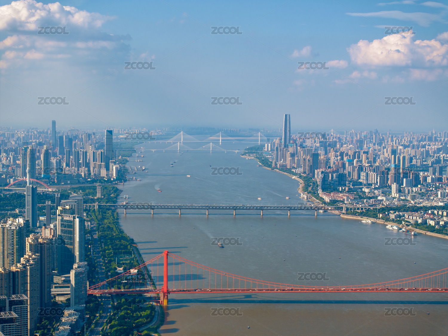 航拍夏季白天武汉长江上的桥梁和城市天际线