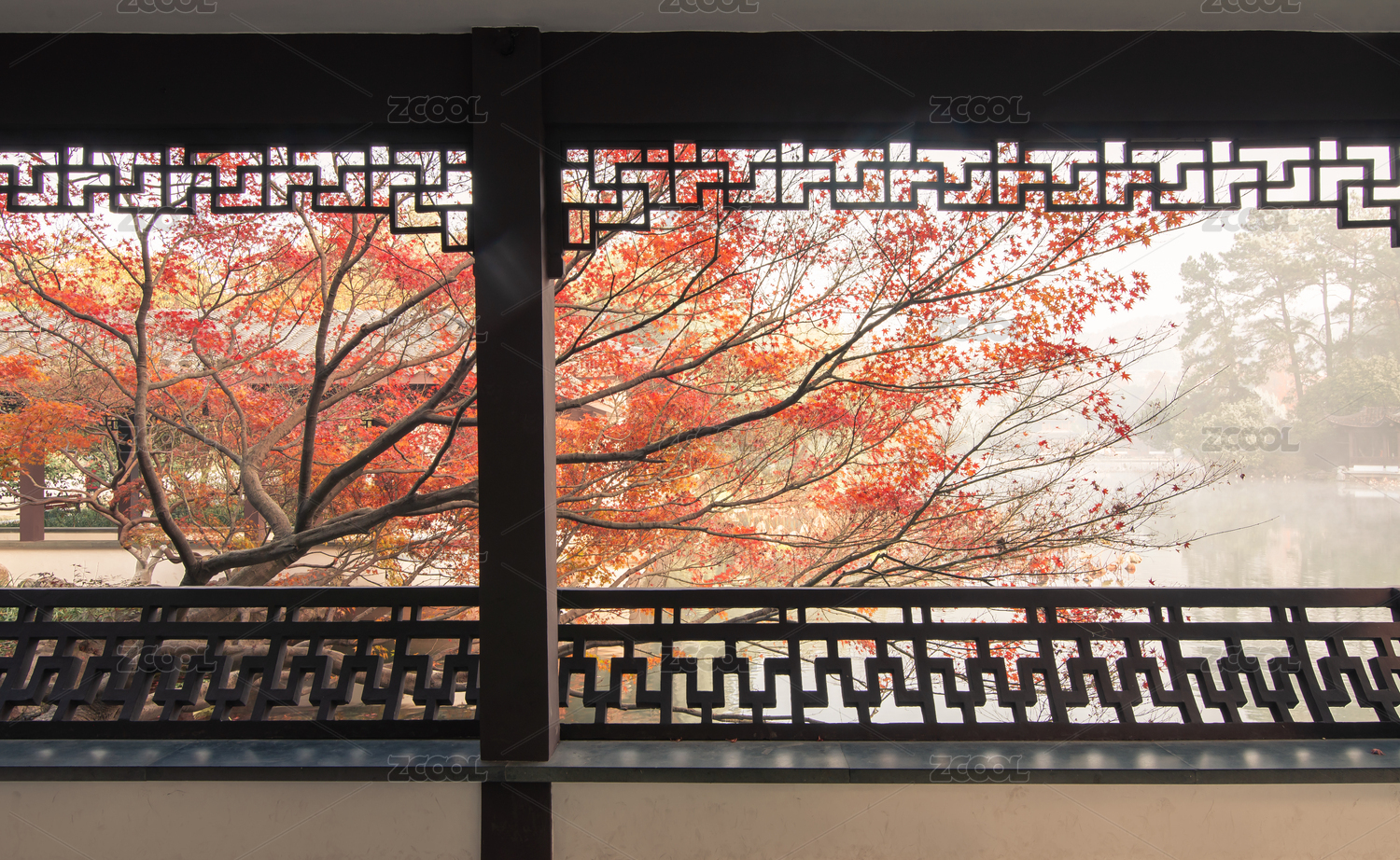 杭州曲院风荷-透过花窗赏秋日枫叶景色