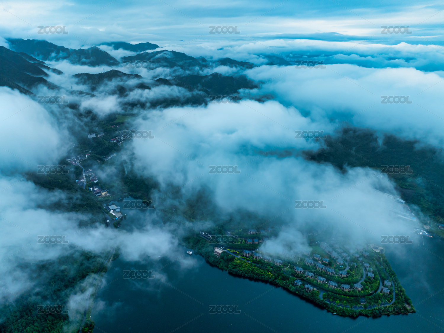 建德新安江湖畔别墅度假村云雾缭绕鸟瞰航拍