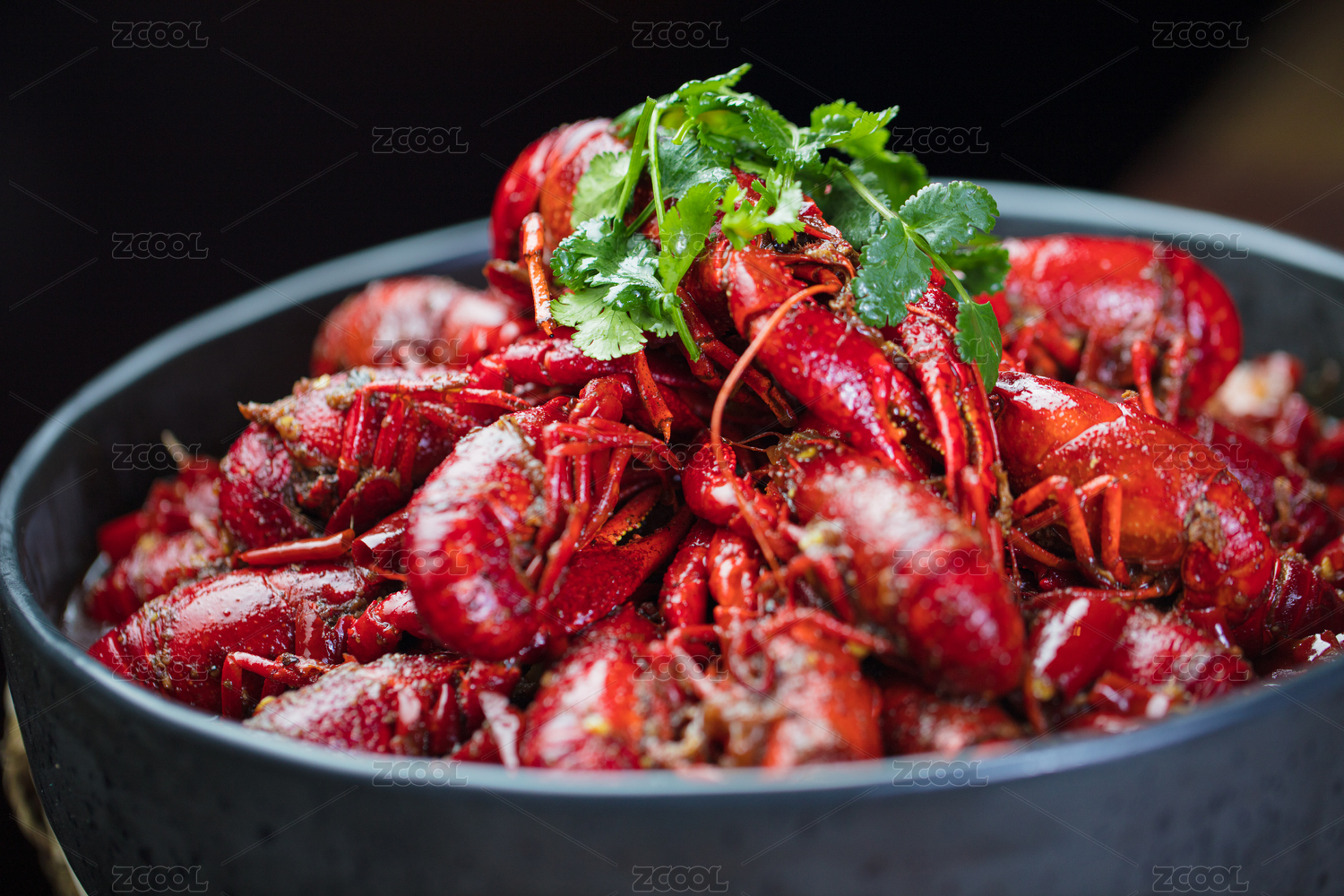 黑色背景下盛满一盆的红烧小龙虾