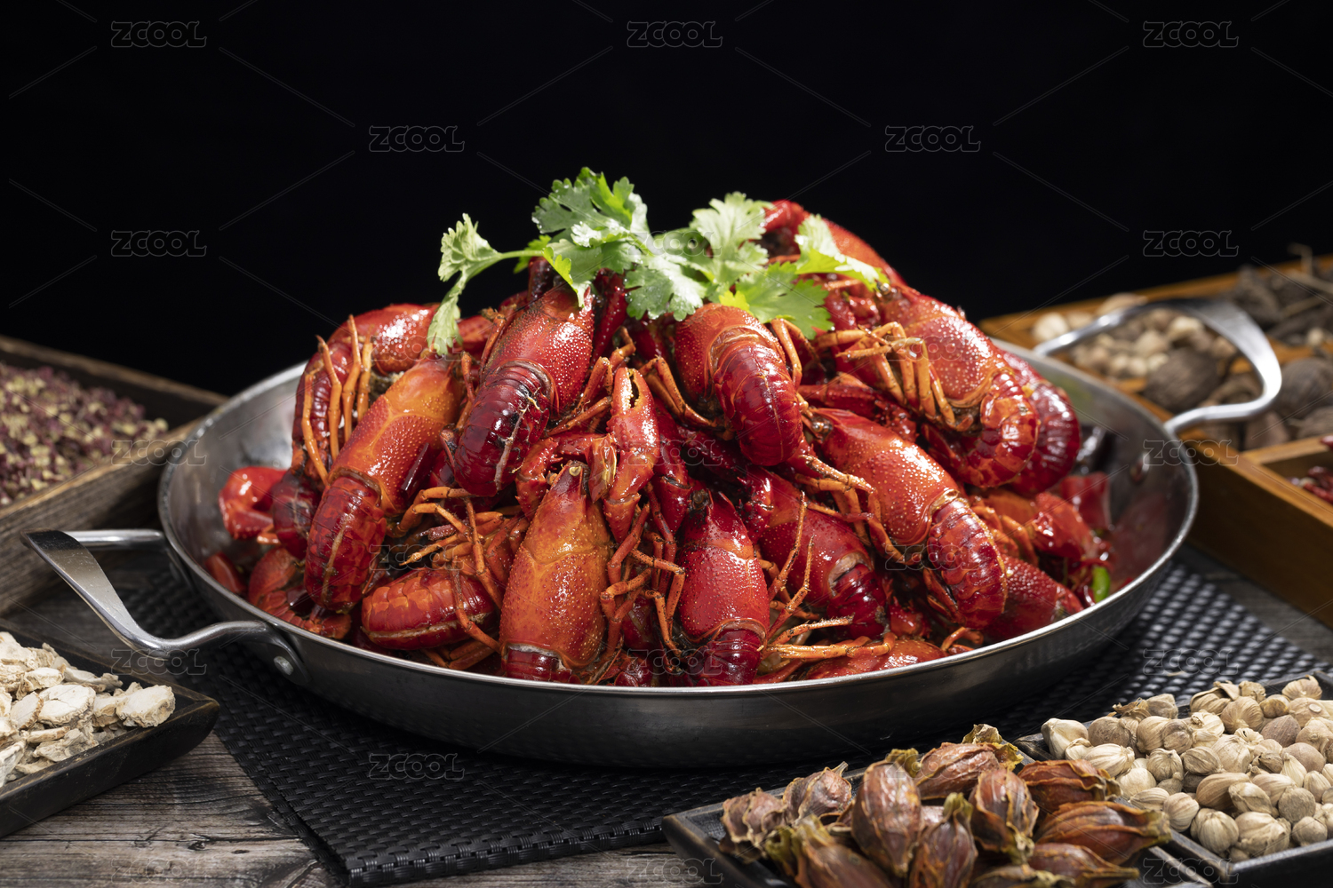 中国传统美食麻辣小龙虾整齐的装在铁锅中