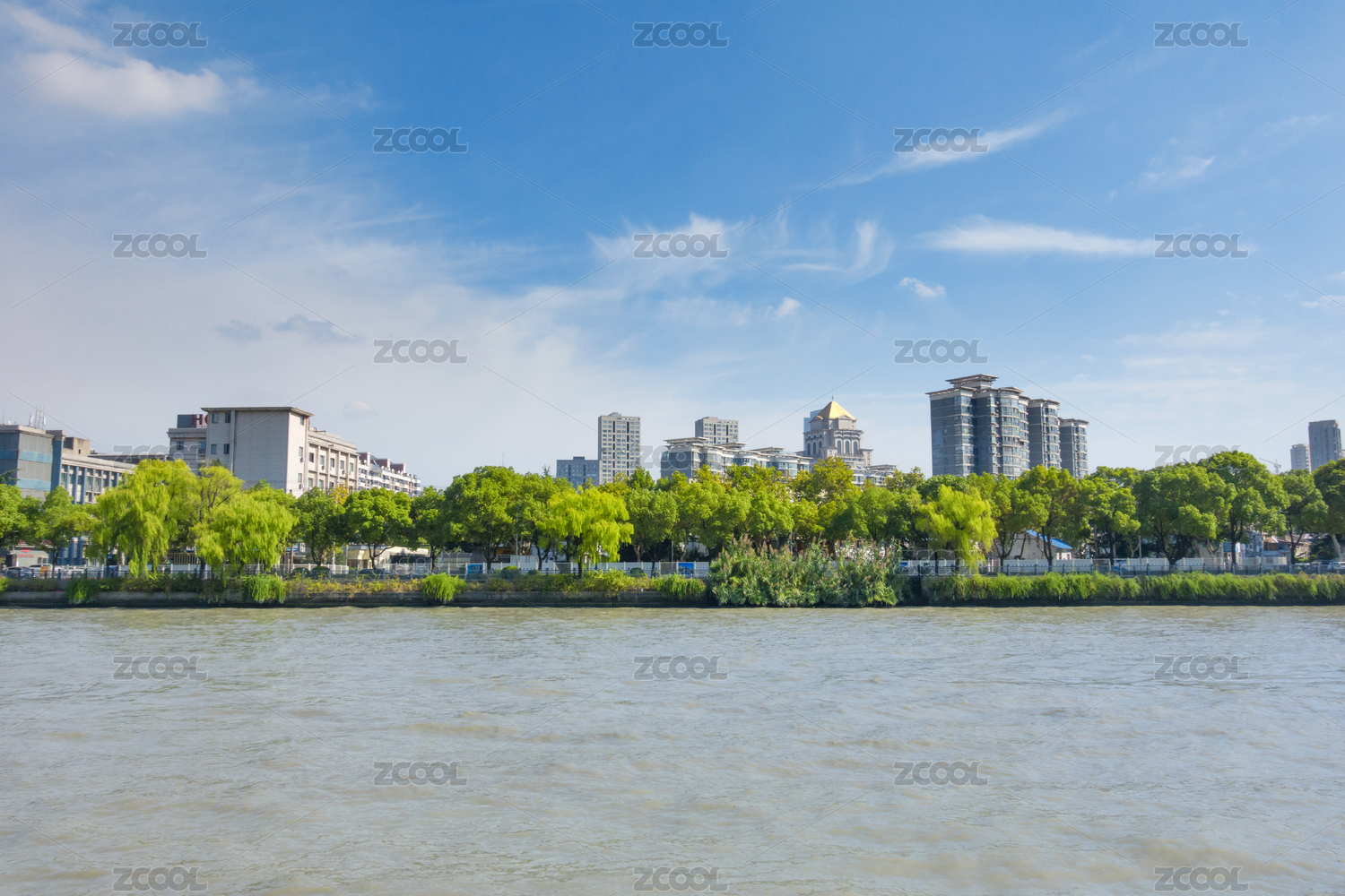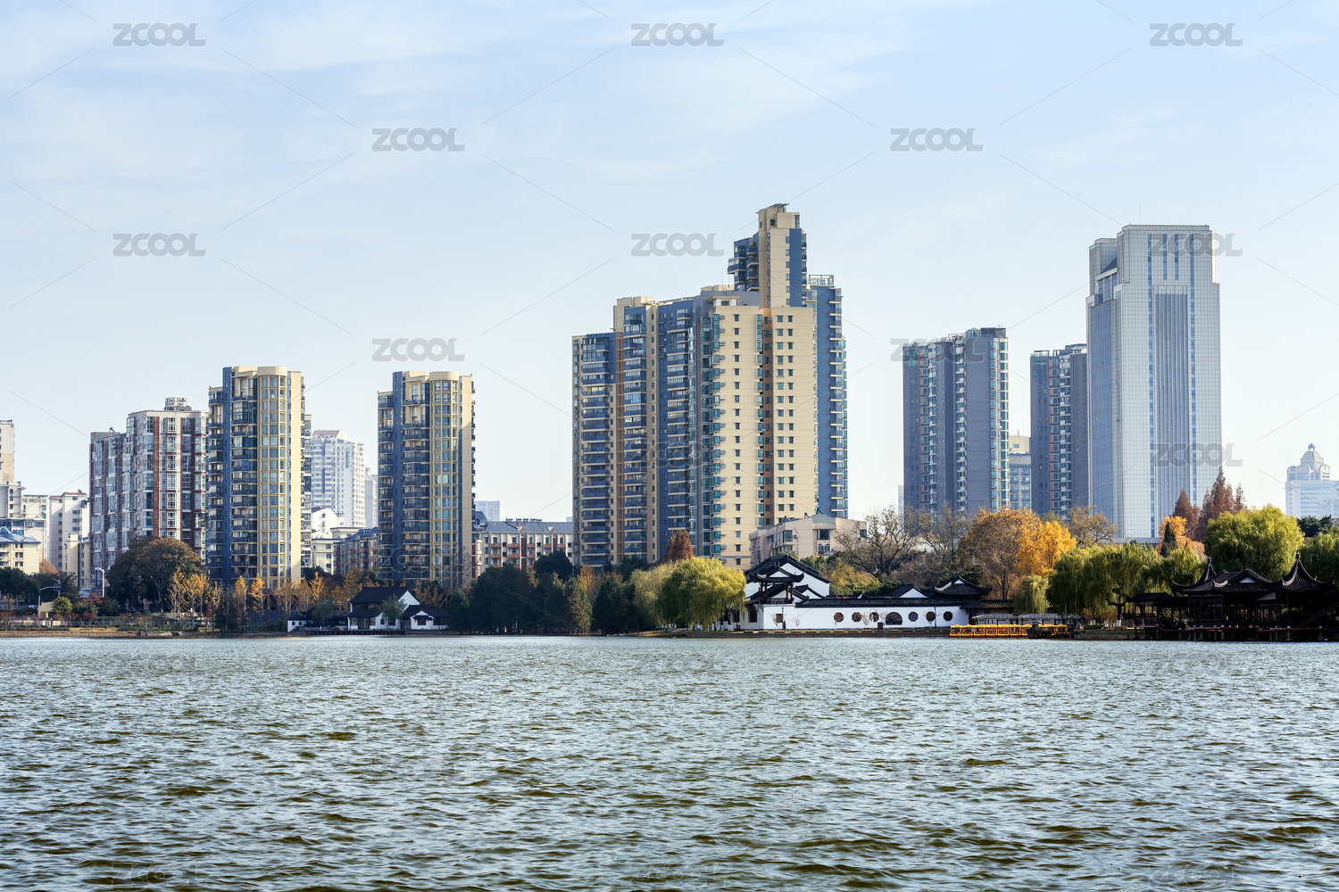 中国江苏省南京市莫愁湖公园湖畔楼宇建筑风光