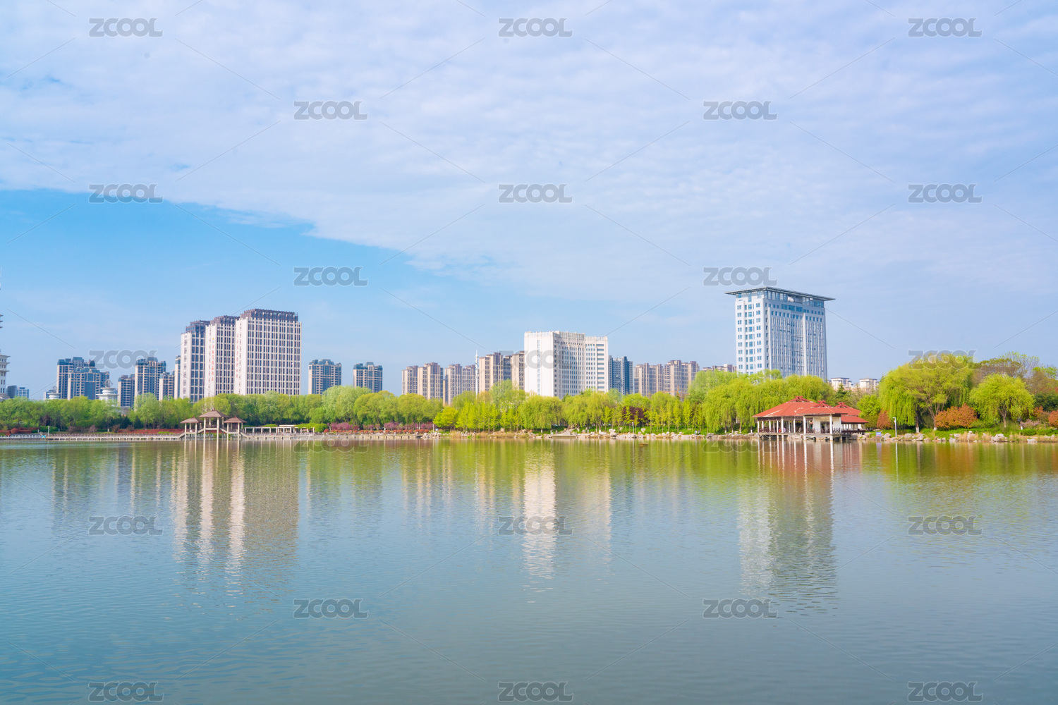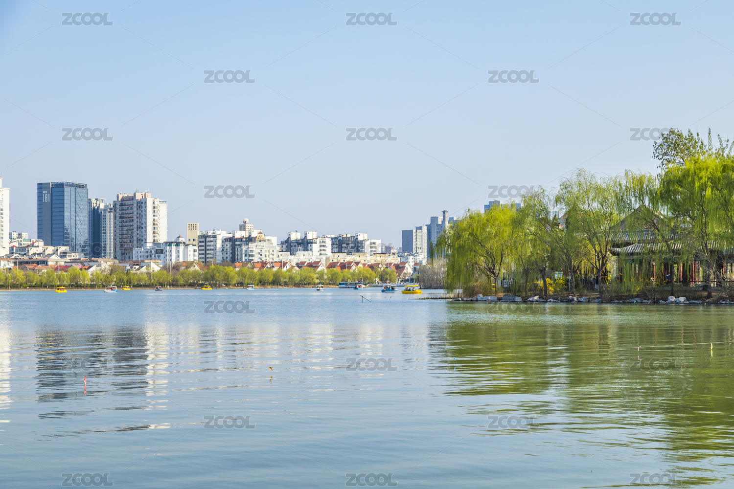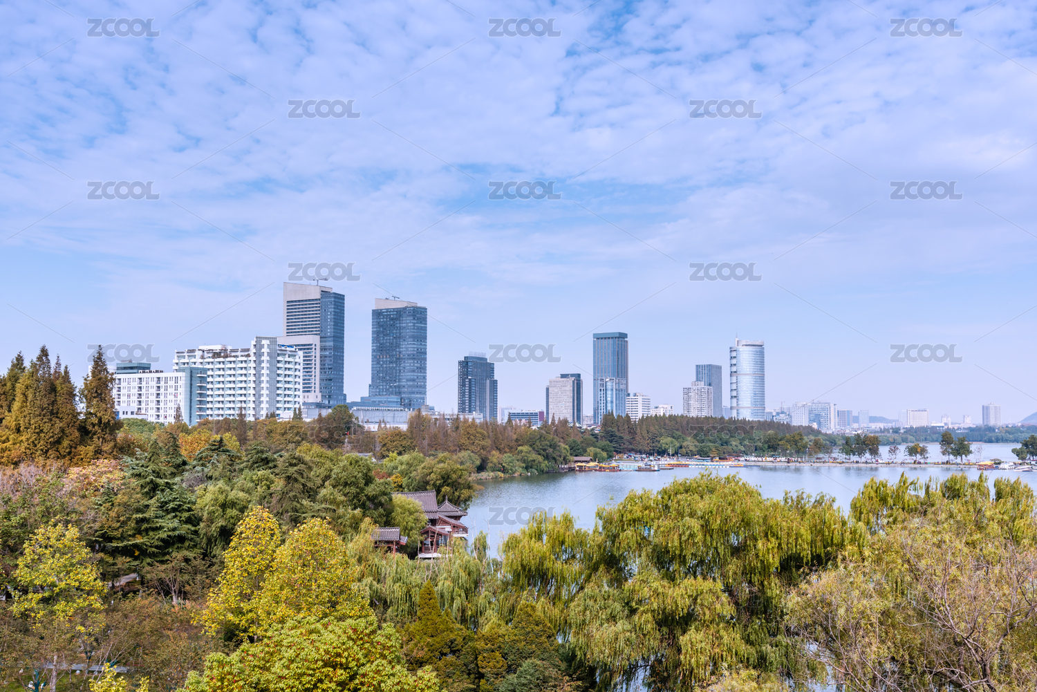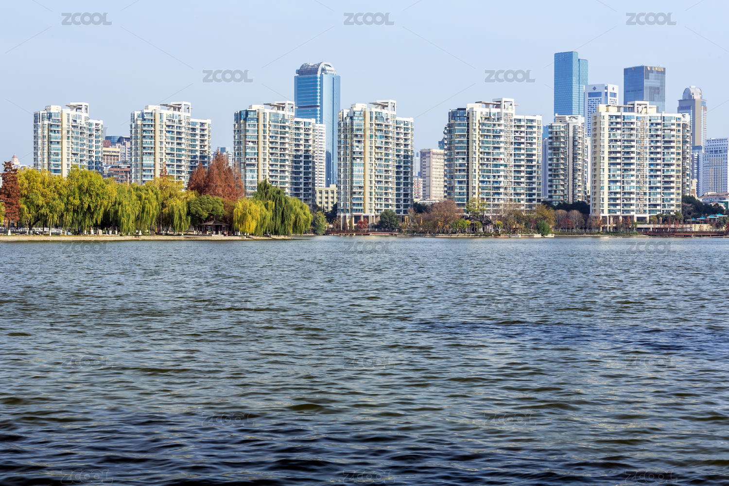 中国江苏省南京市莫愁湖公园湖景城市楼宇建筑风光