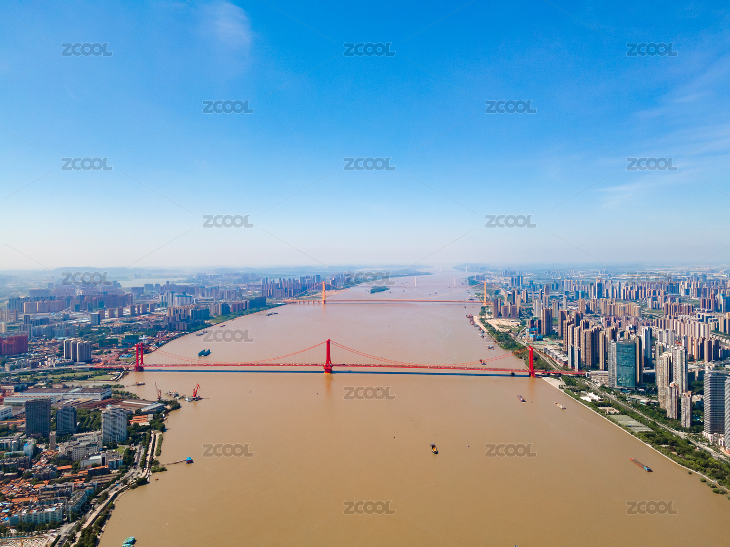 航拍夏季白天武汉长江上的桥梁和城市天际线