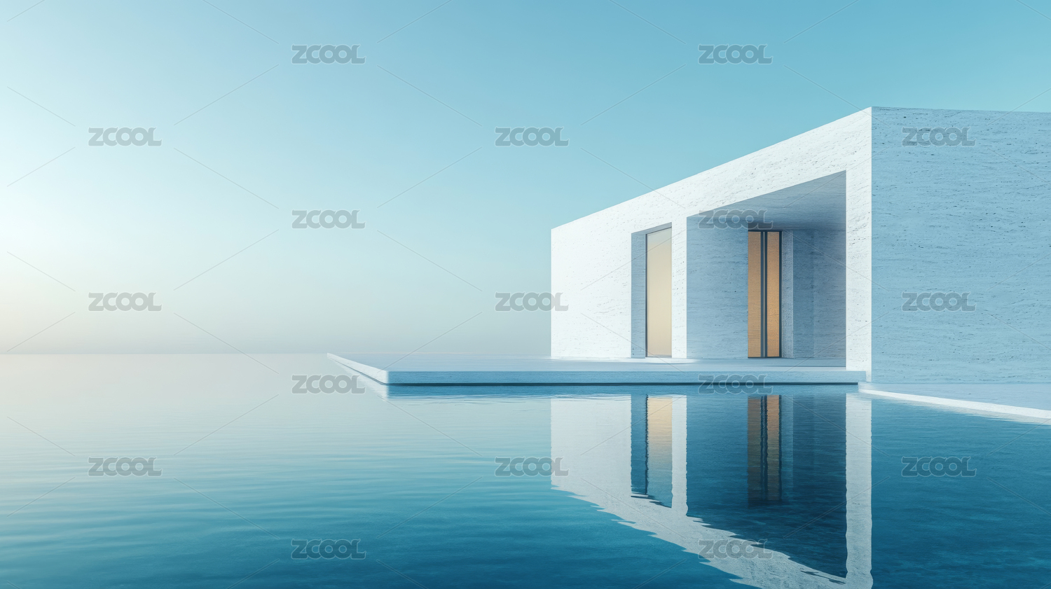 现代,虚拟,建筑,宁静,水面,蓝天,白云,别墅,简约,房屋