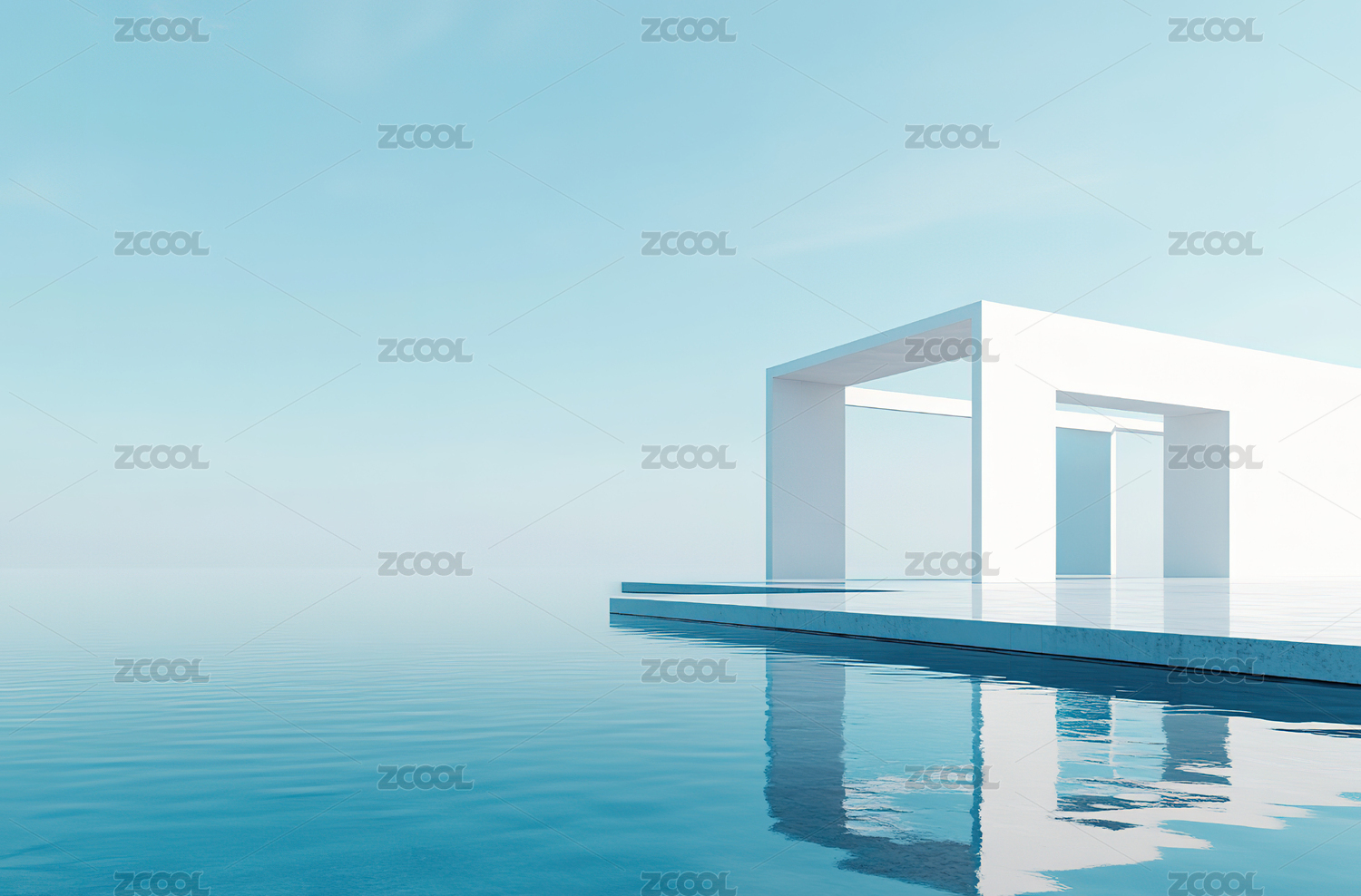 蓝色水面上的现代虚拟建筑