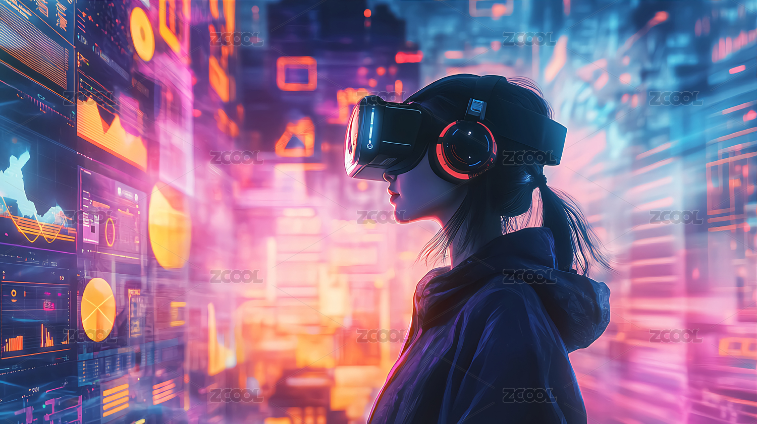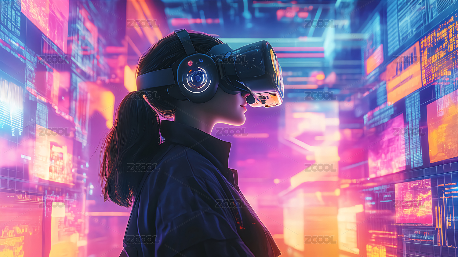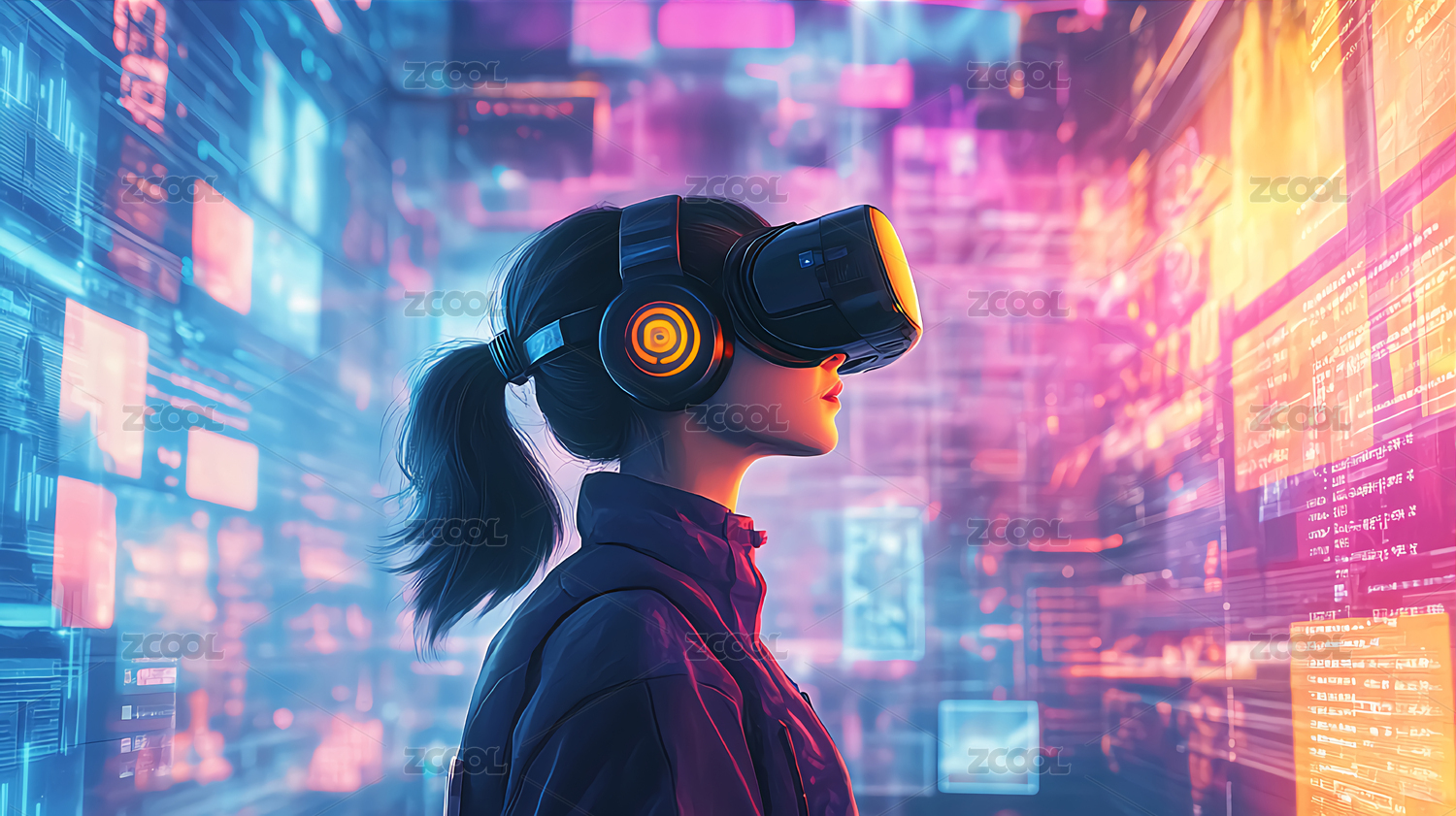 未来科技背景插画——戴着VR眼镜的女人