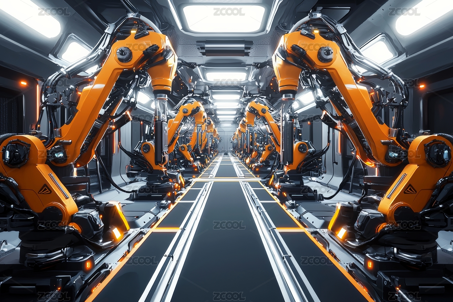 未来工厂车间里机器人工作装配线场景