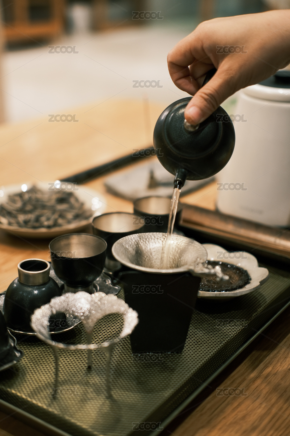 手拿茶具倒茶