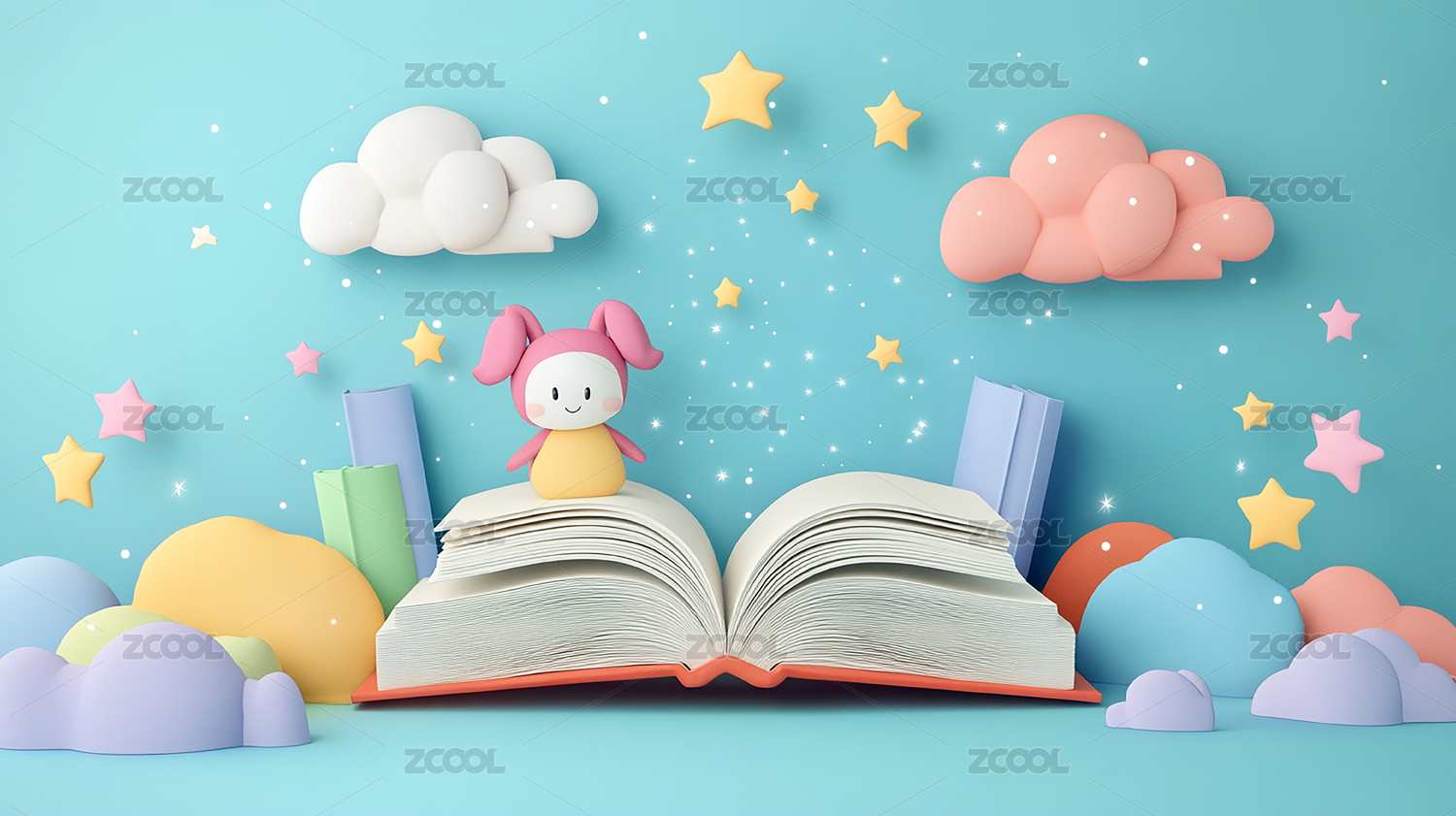 翻开的书本星星纸张蓝色背景开学季3D插画