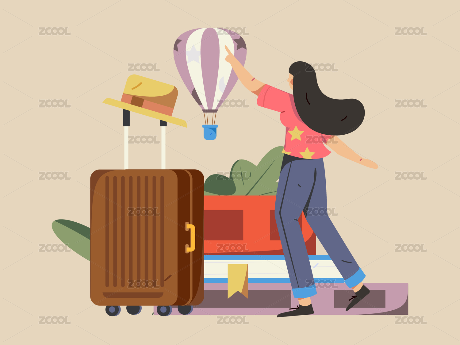 扁平化的旅行人物与热气球