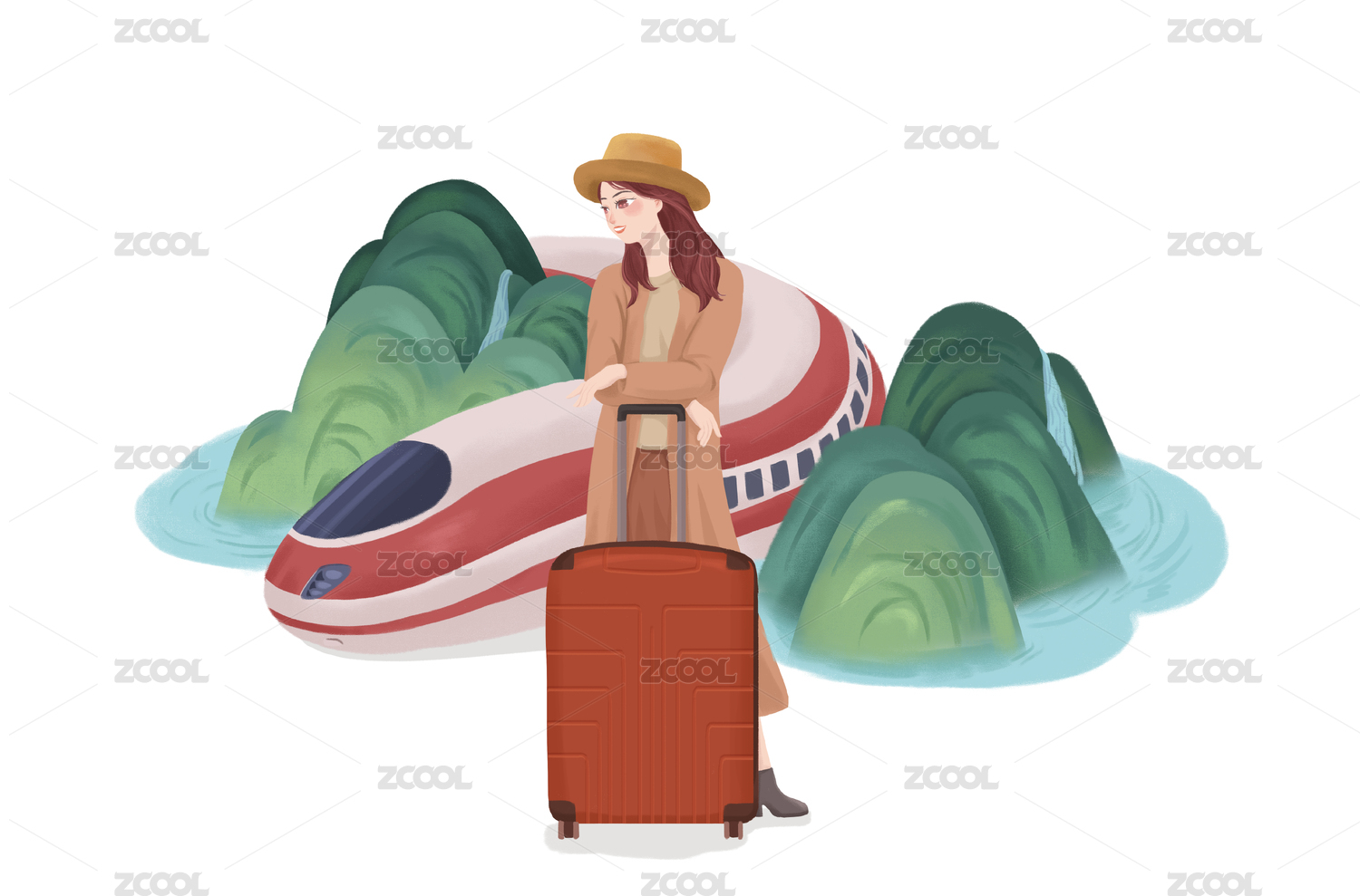 一个扁平风美少女推着拉杆箱戴着沙滩帽