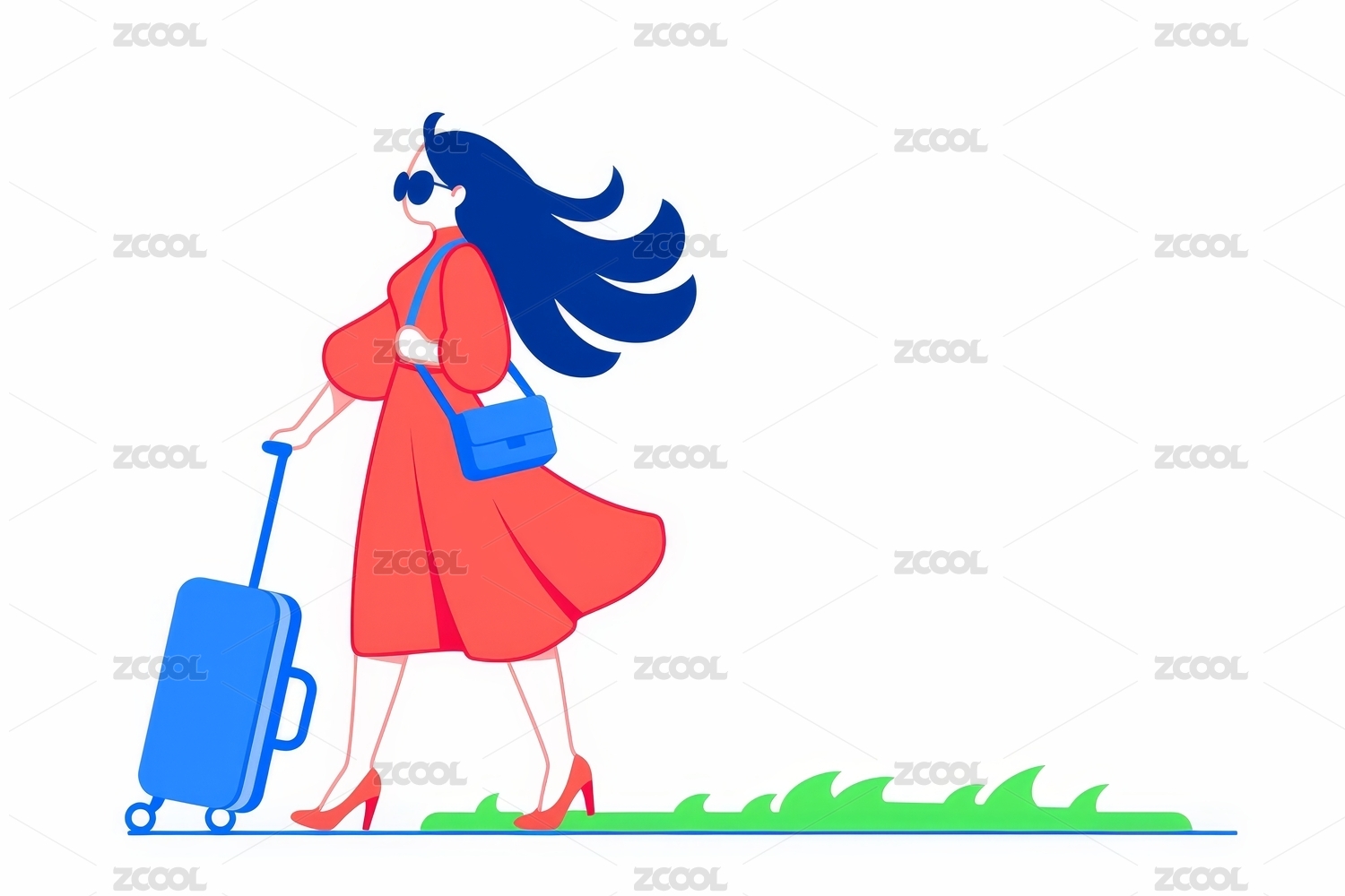 拉着行李箱去旅行的女孩矢量插画