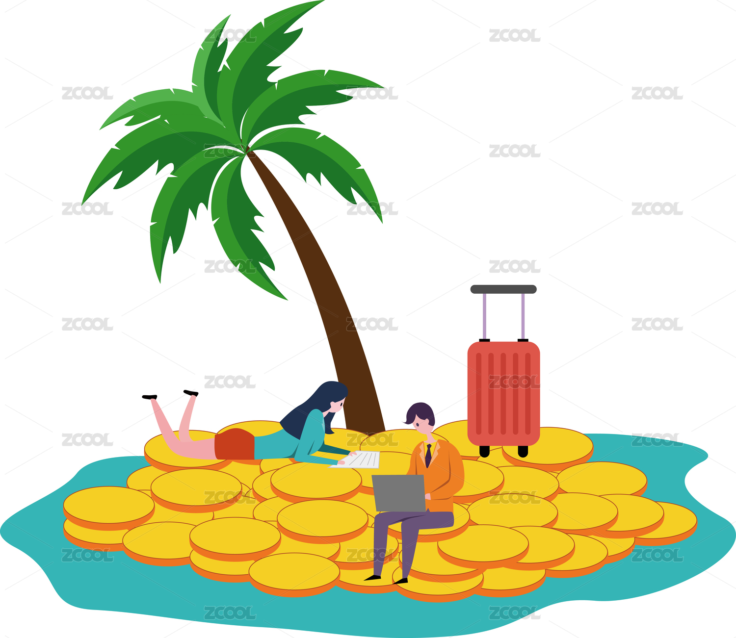 扁平化的人物与摇钱树及热气球