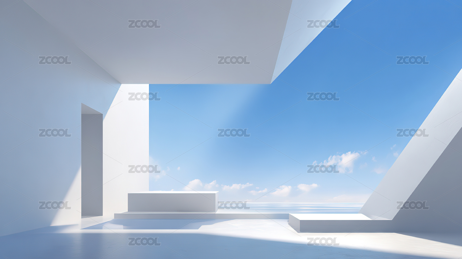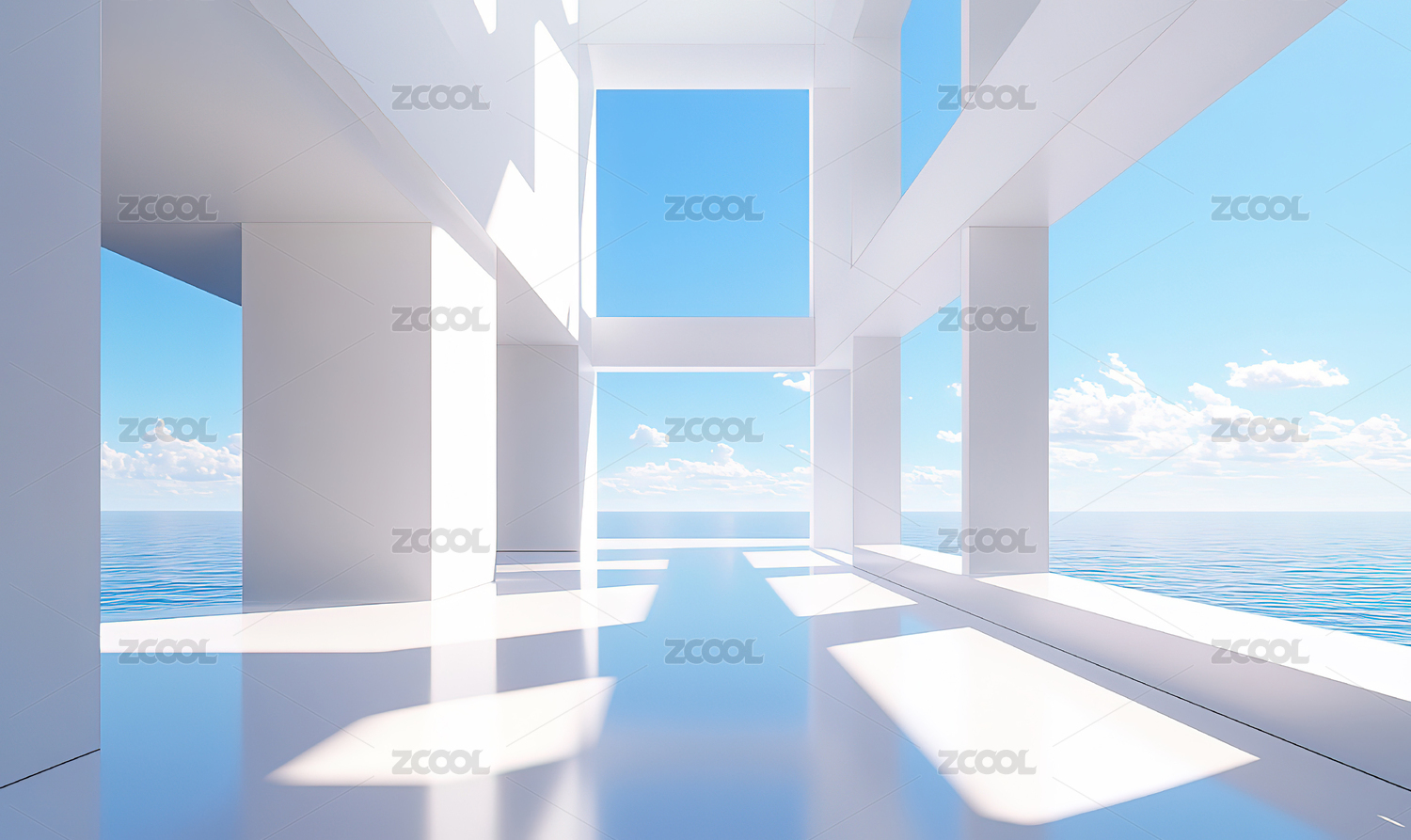 白色建筑与海景的光影空间