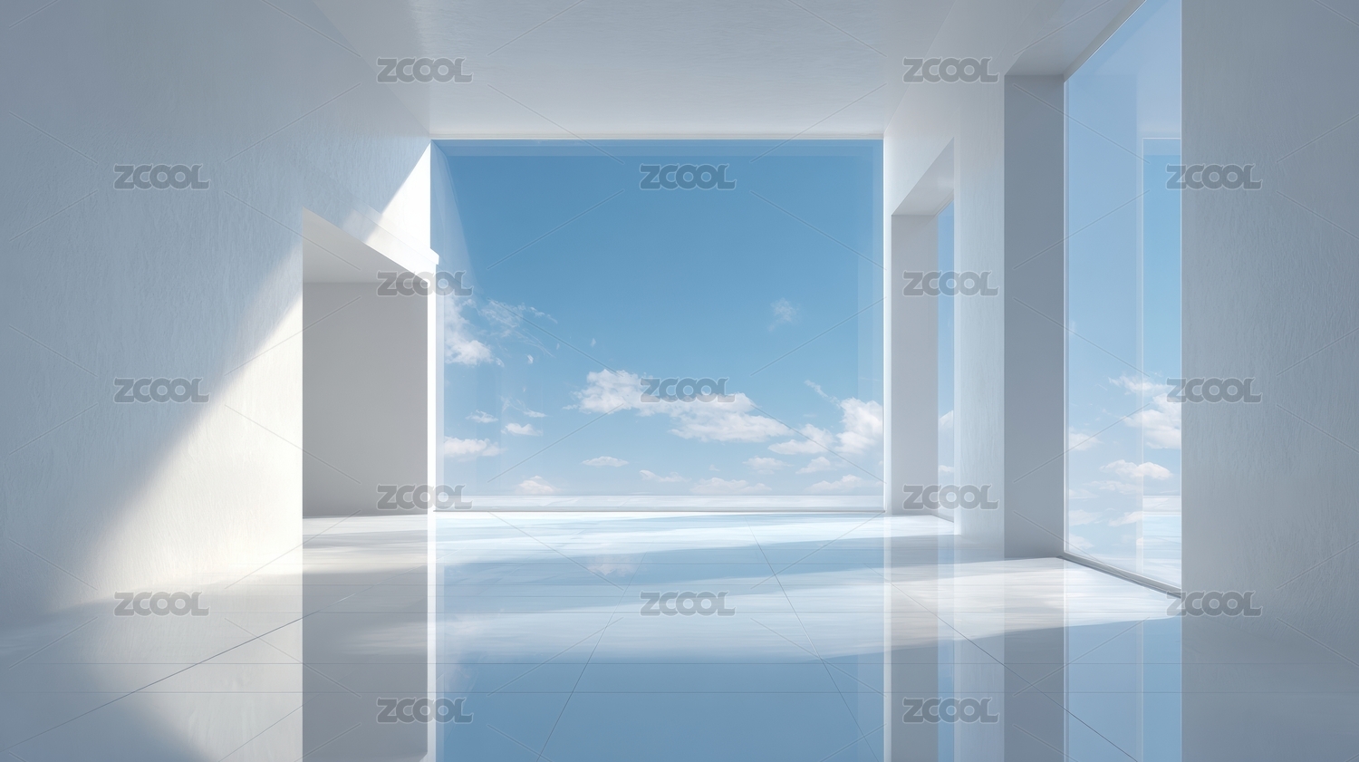 滨海白色有大落地窗室内空间光影三维渲染