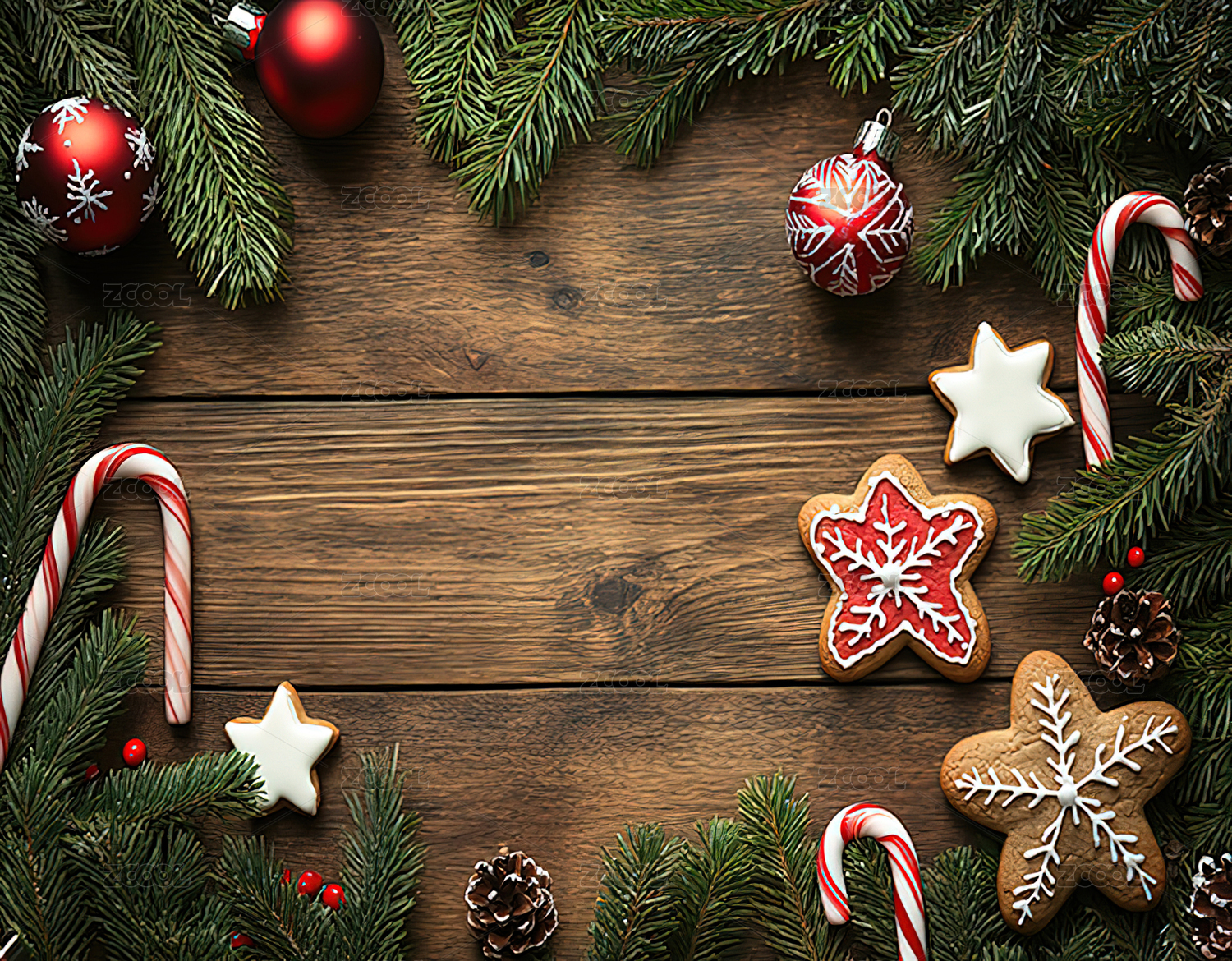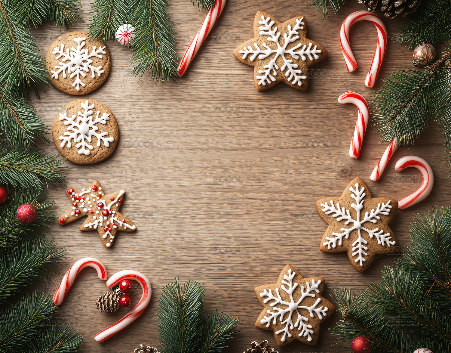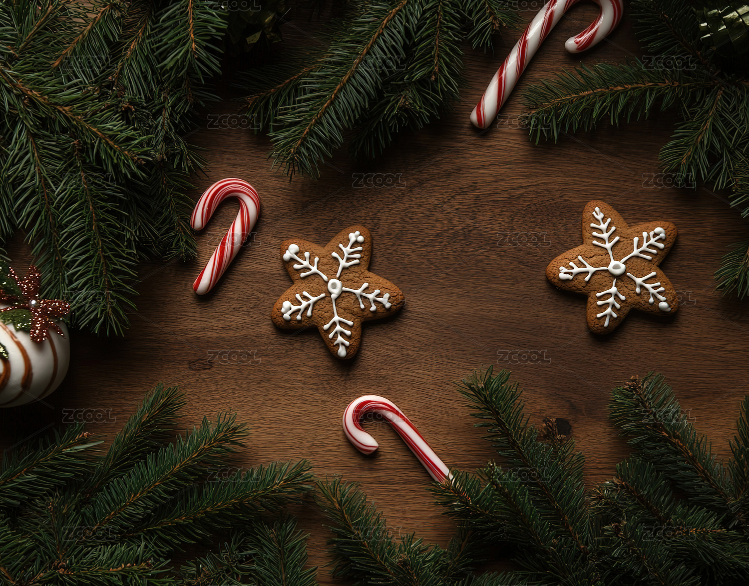 在桌子上的圣诞装饰品和饼干的正上方