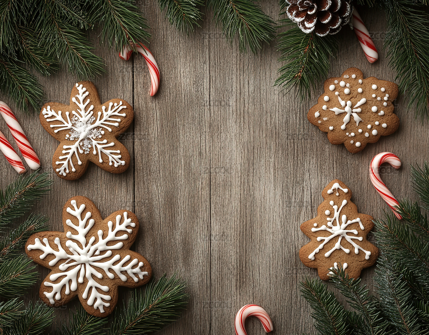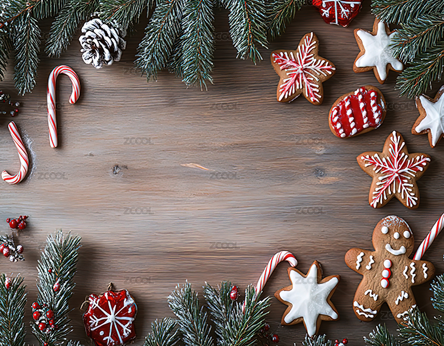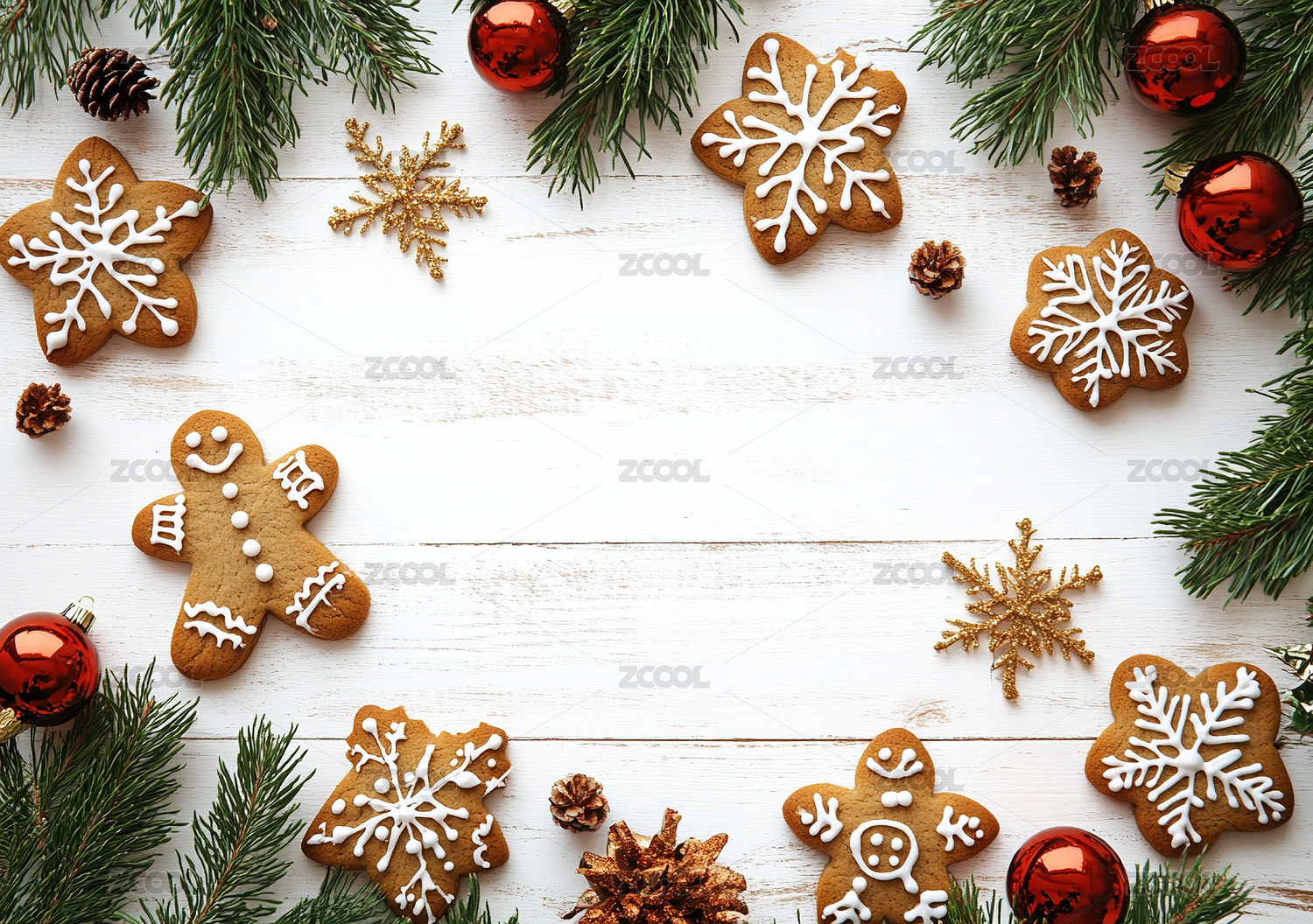 在桌子上的圣诞装饰品和饼干的正上方