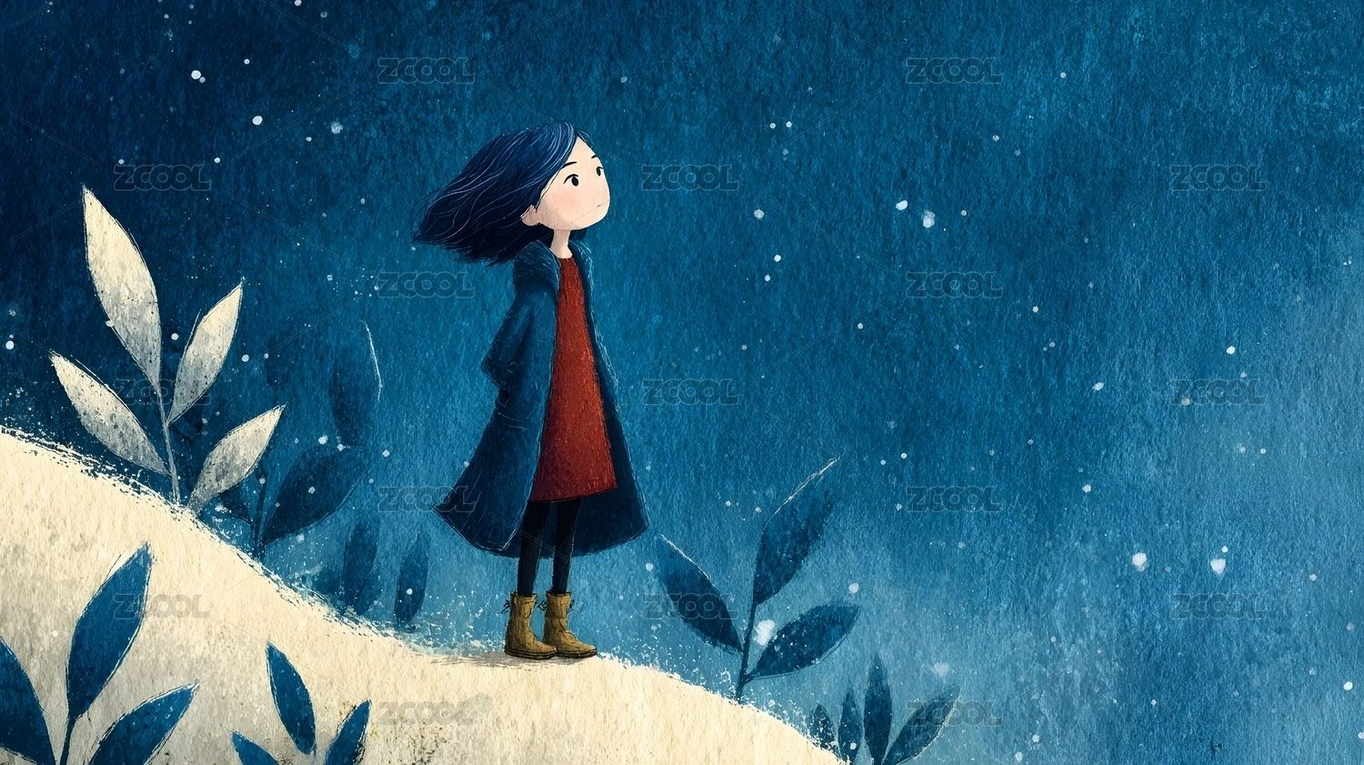 女孩站在路灯下手绘插画