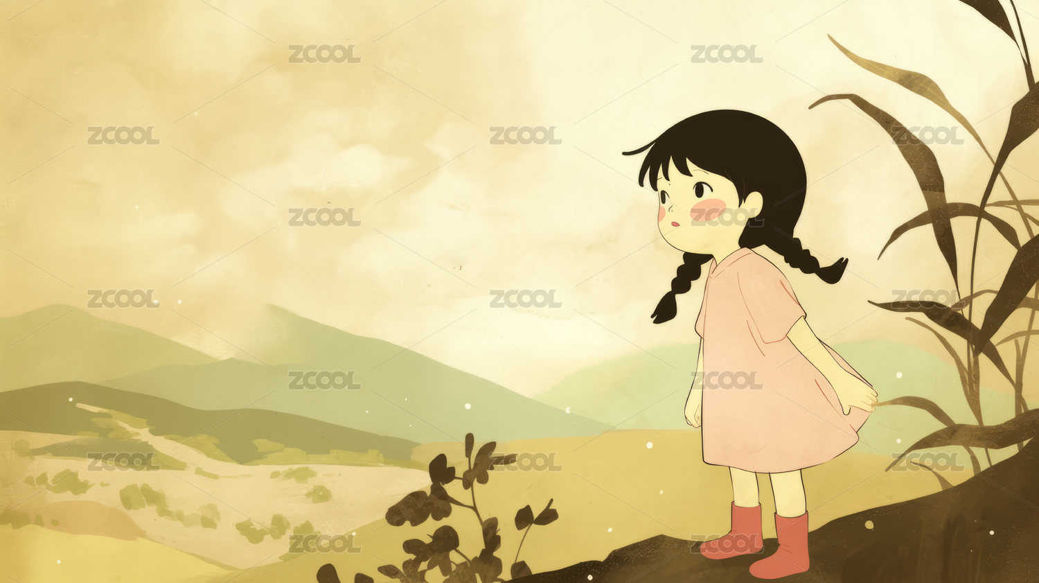 女孩户外自然风景小清新插画