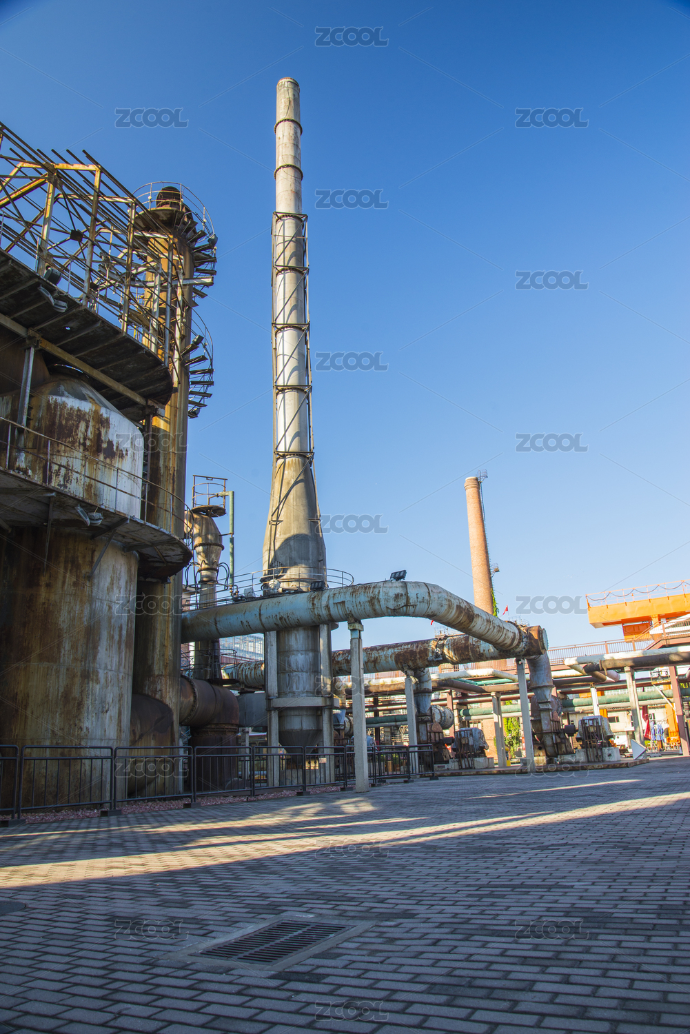 蓝天下的中国北京首钢遗址工业公园中废弃的工业设备