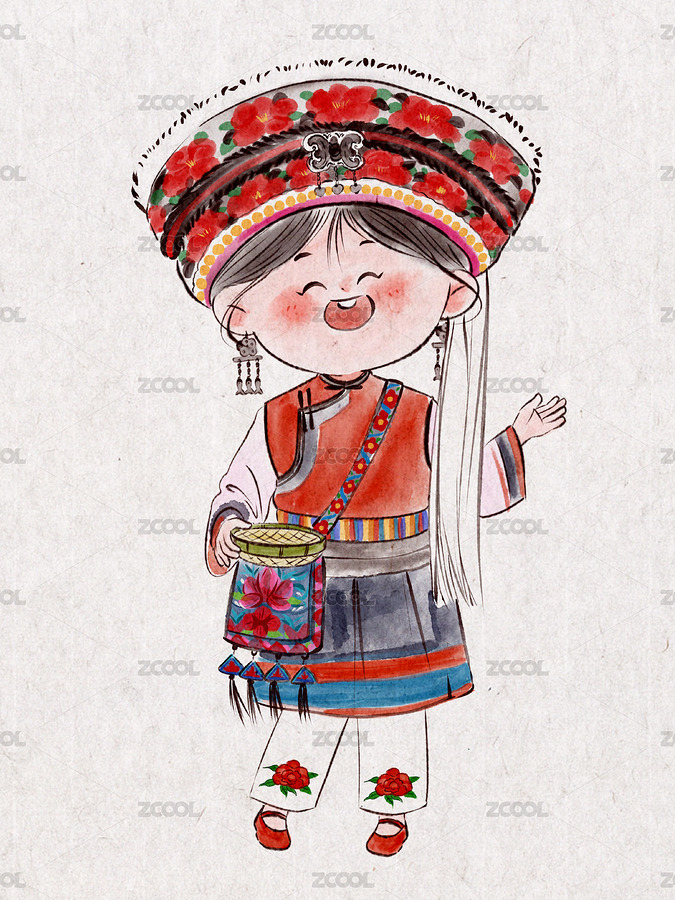 五十六个民族,插画,少数民族,卡通,水墨,中国风,女性,元素,白族