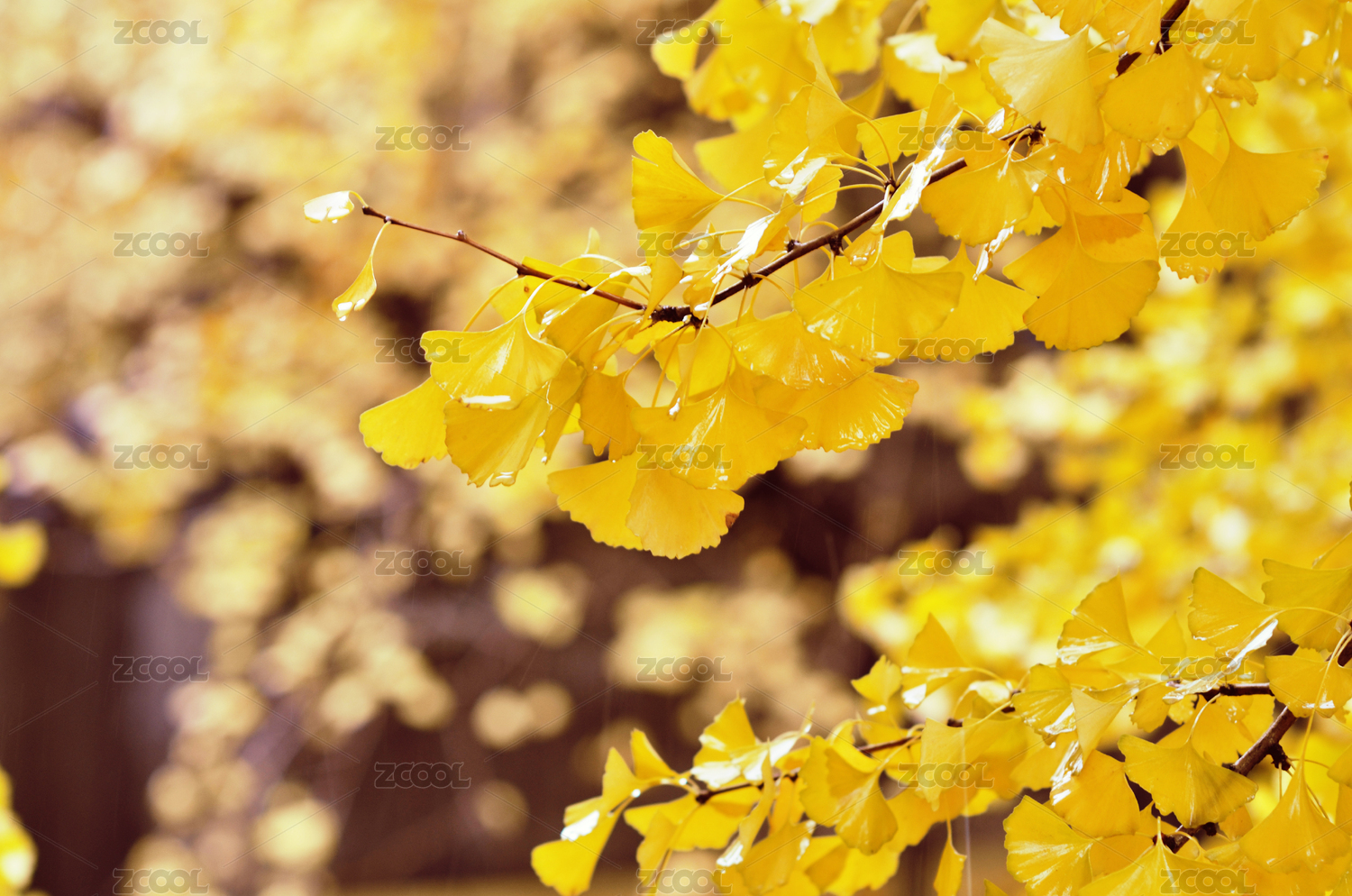 深秋阳光下的枝头上的银杏叶