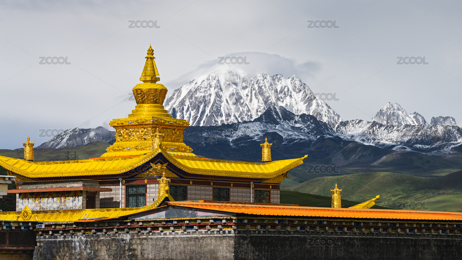 四川甘孜州塔公草原雅拉神山下的金色佛塔