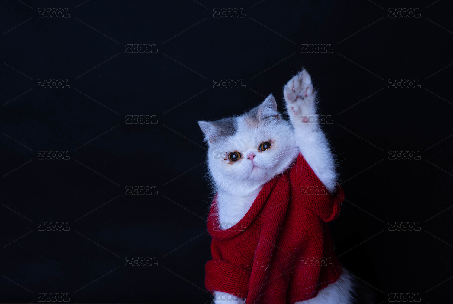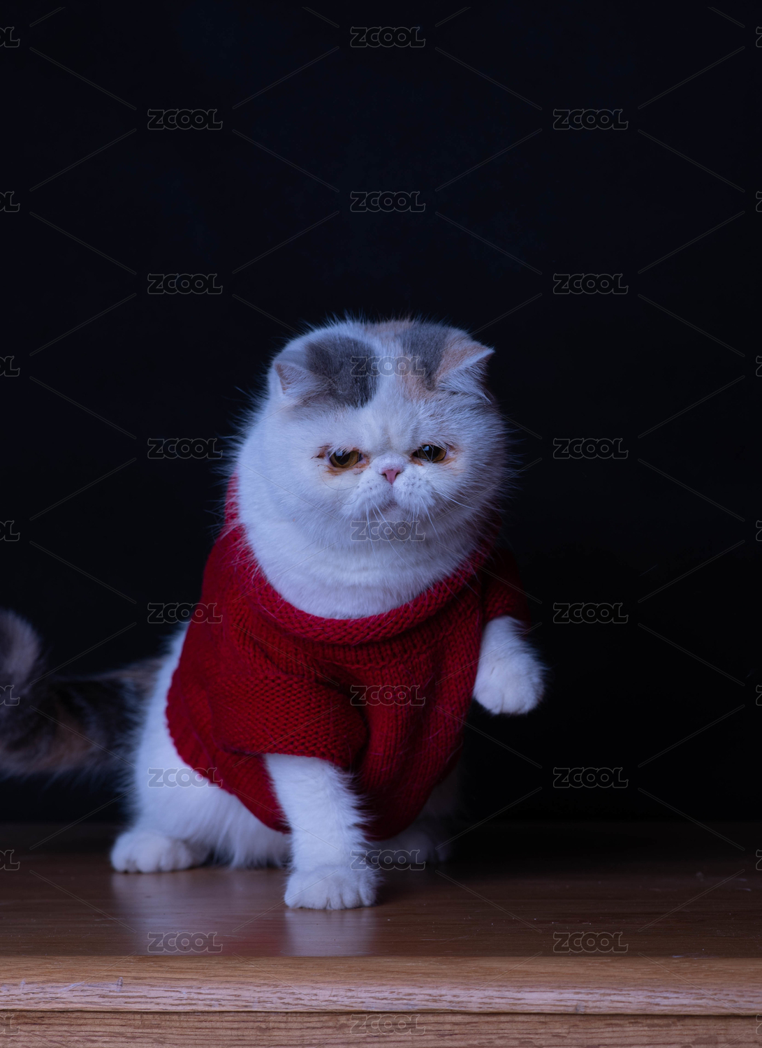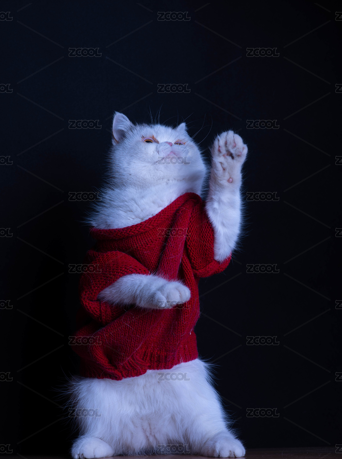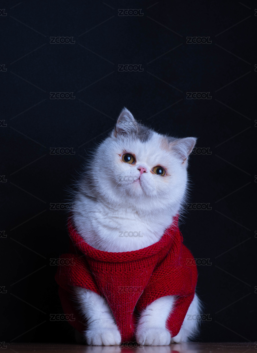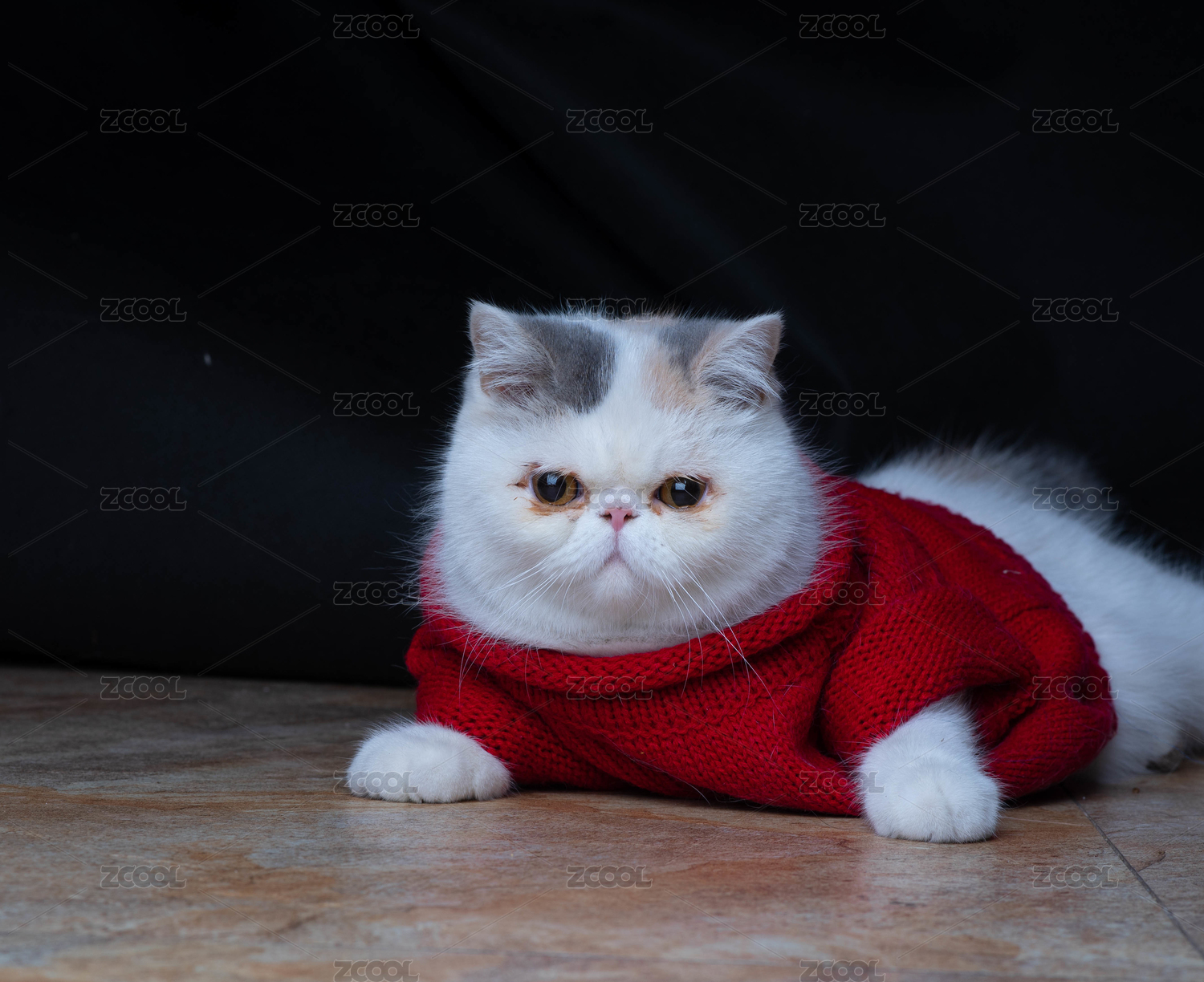 一只穿着红色毛衣的加菲猫睁大了眼睛看着前