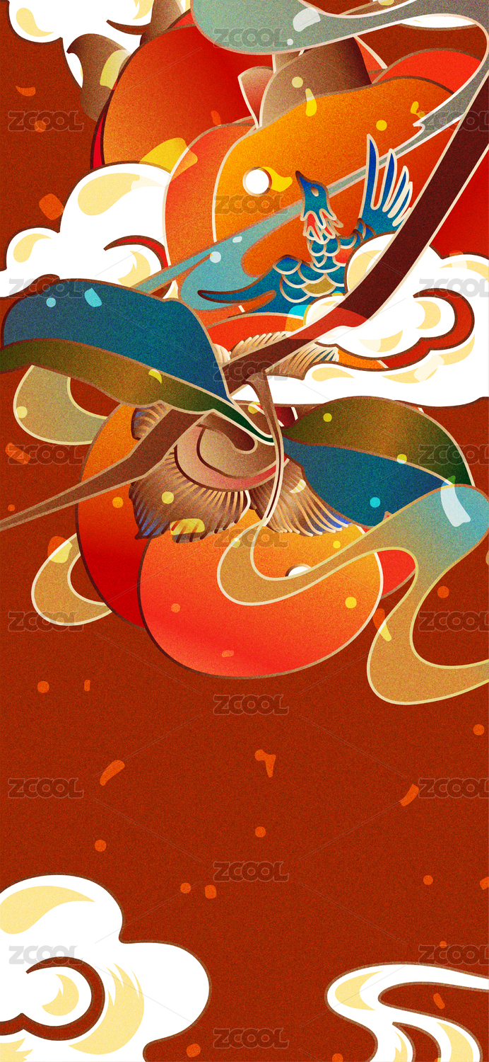 国风国潮树枝上的红柿子矢量插画海报