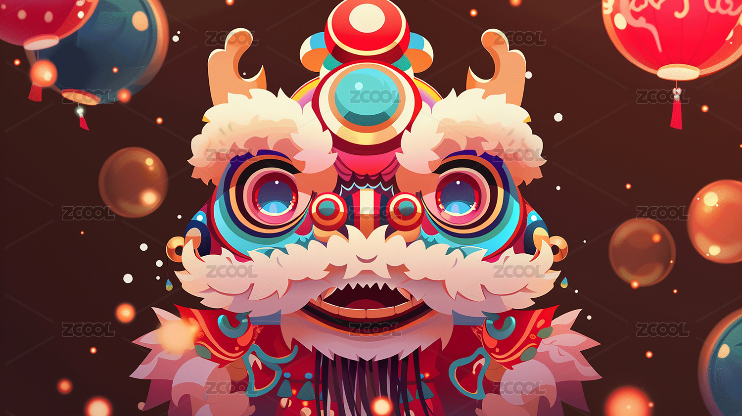 元旦新年过年灯笼绣球舞狮手绘插画海报