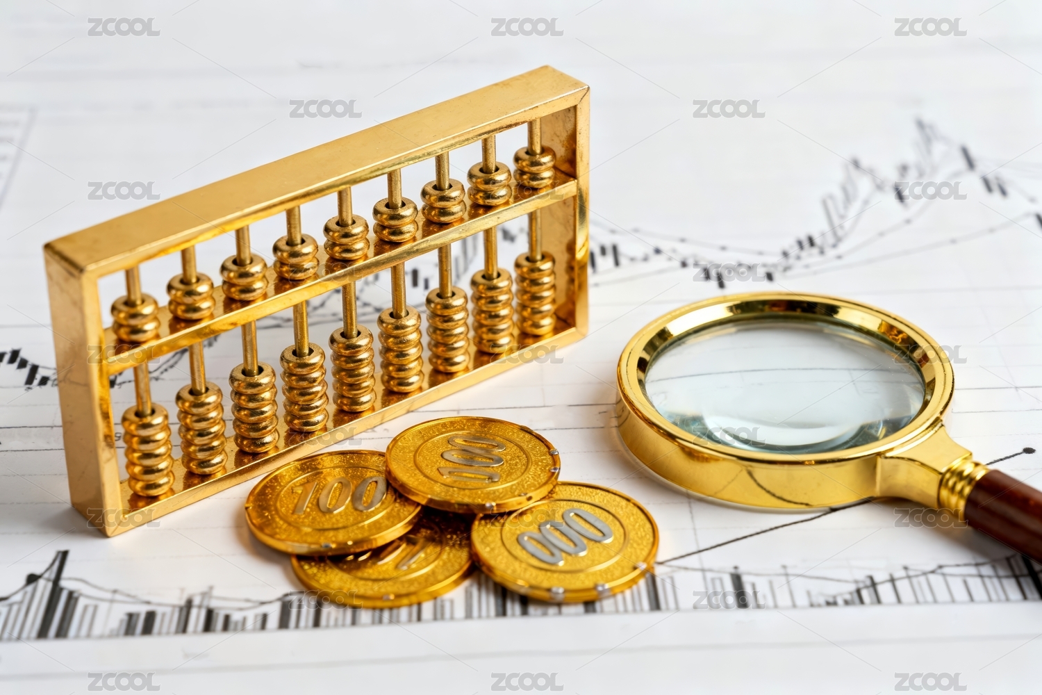 代表股市投资理财的算盘硬币计算器放大镜特