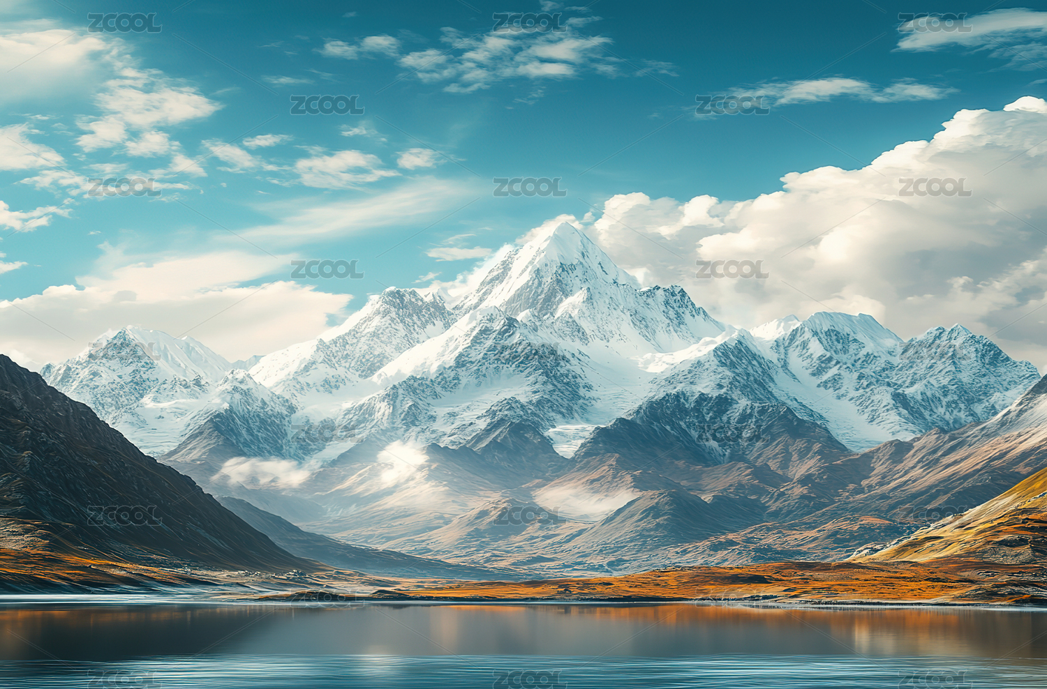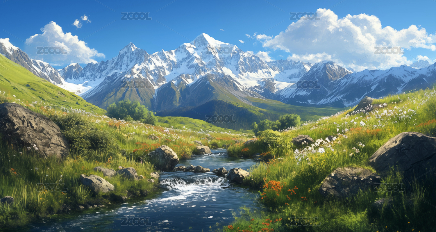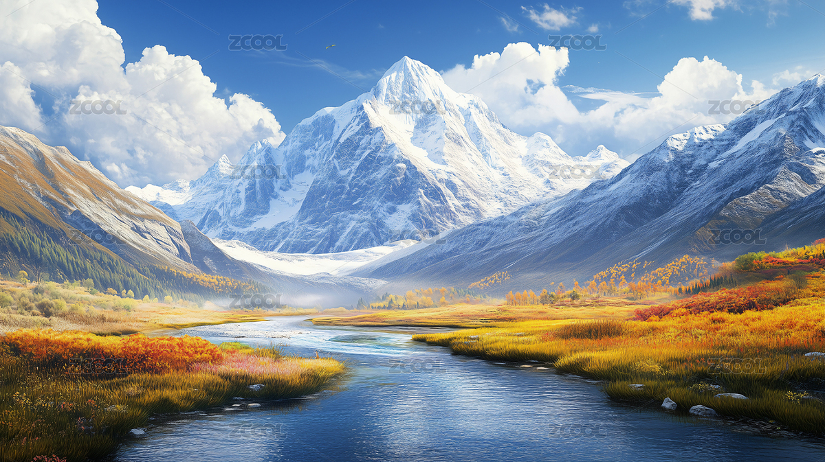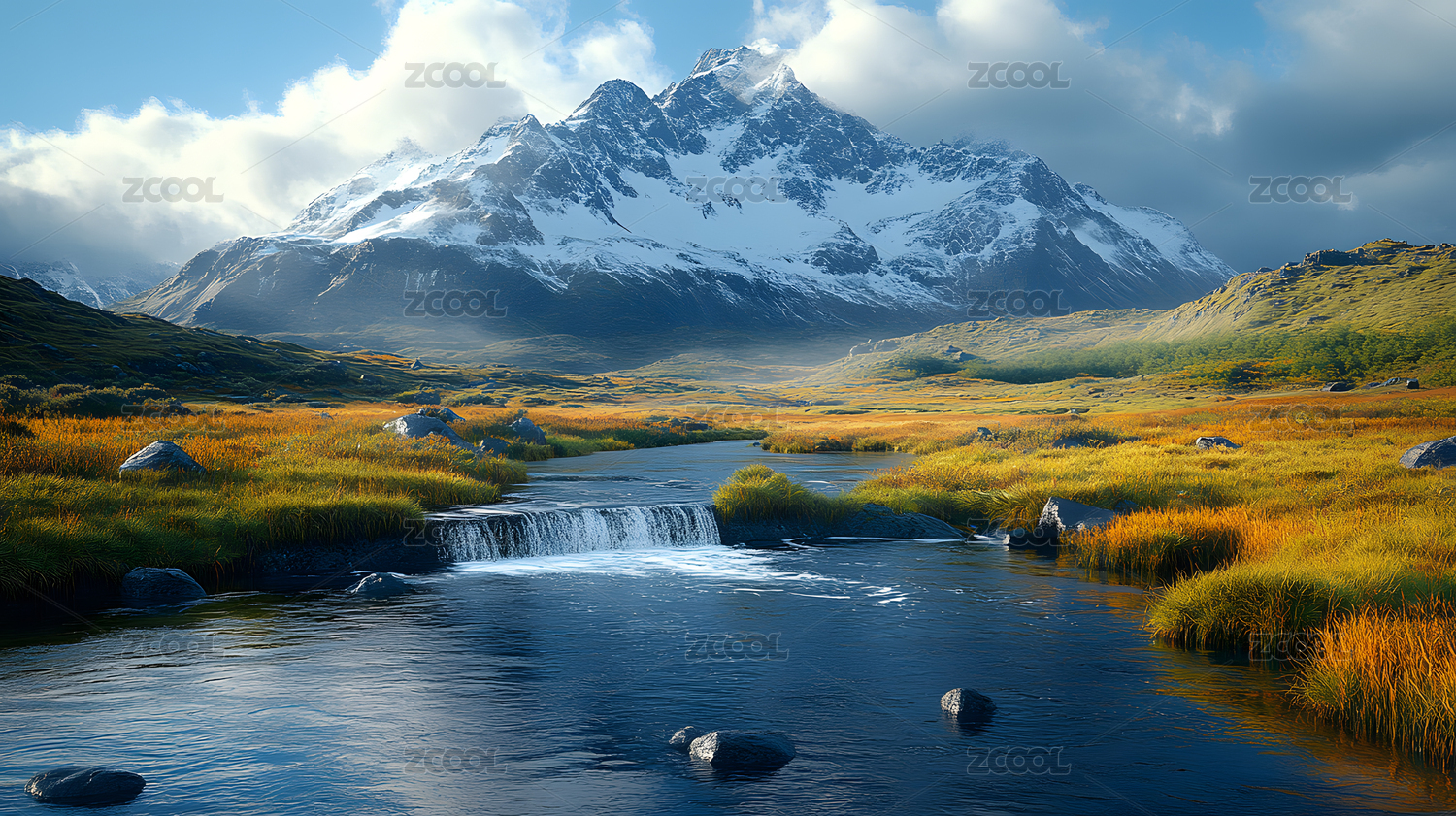 唯美的雪山枯萎的草地冰川溪流风景油画