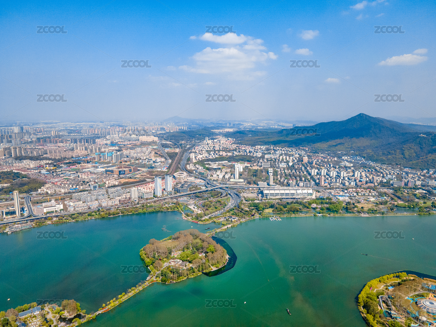 航拍中国江苏省南京新庄立交桥与玄武湖翠洲