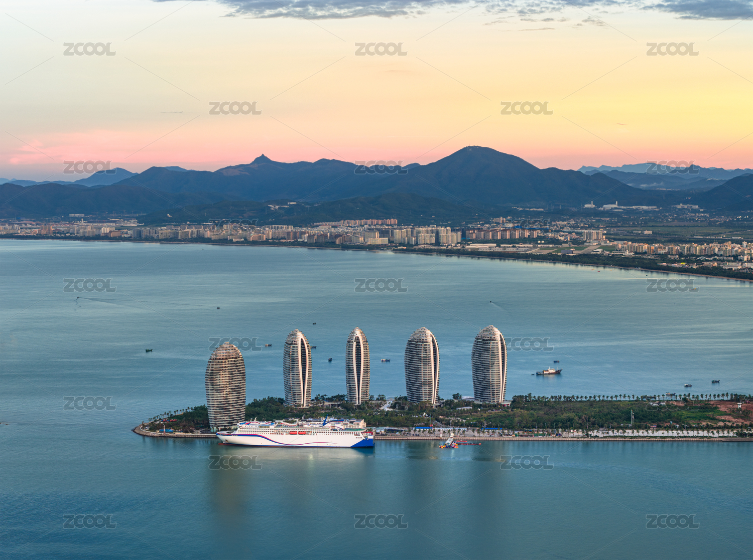 Aerial View of Cruise Home Port and Luxury Hotels on Phoenix Island, Landmark Architecture of Sanya City, Hainan Province, China