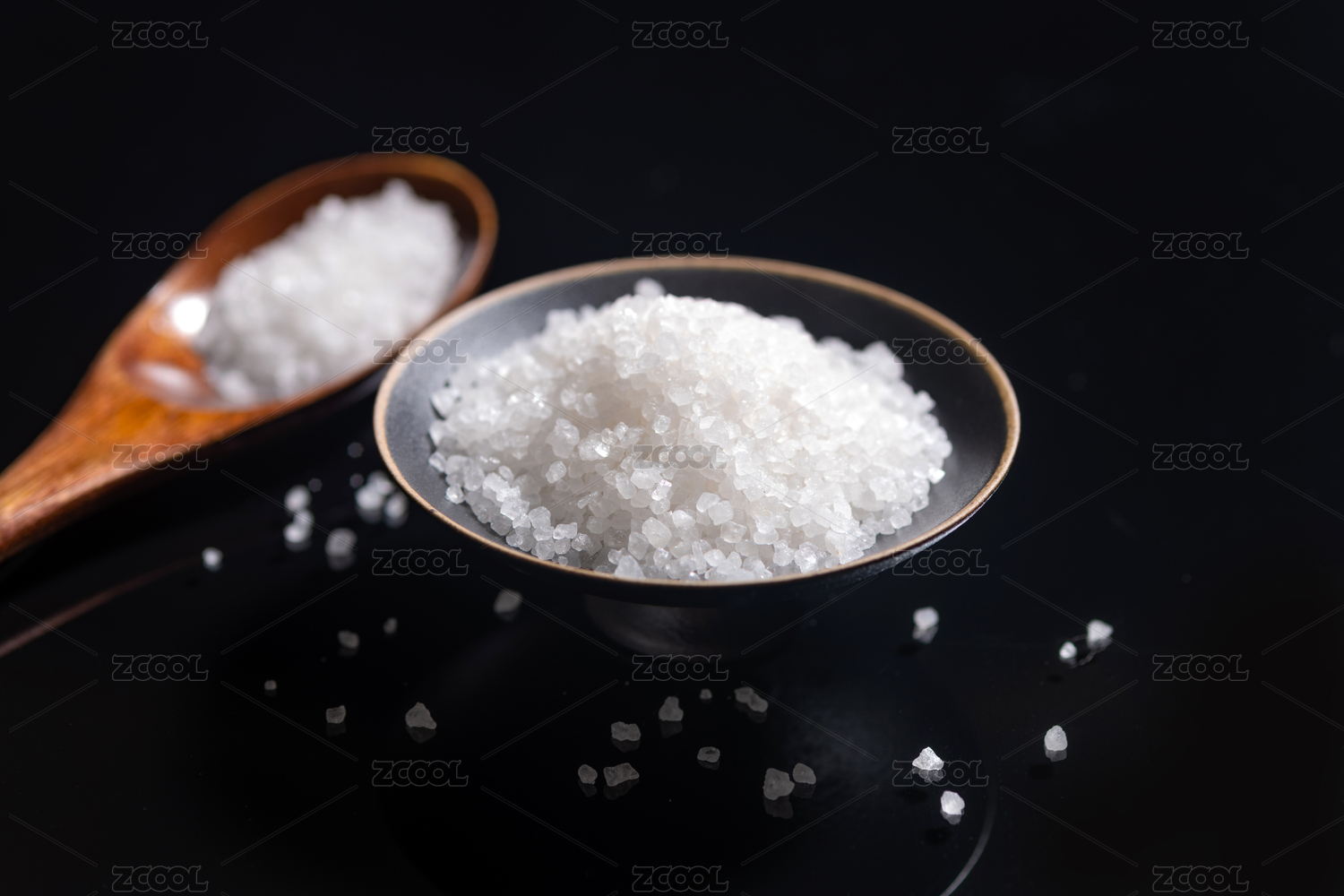 一勺粗海盐和一勺细湖盐在黑色背景上