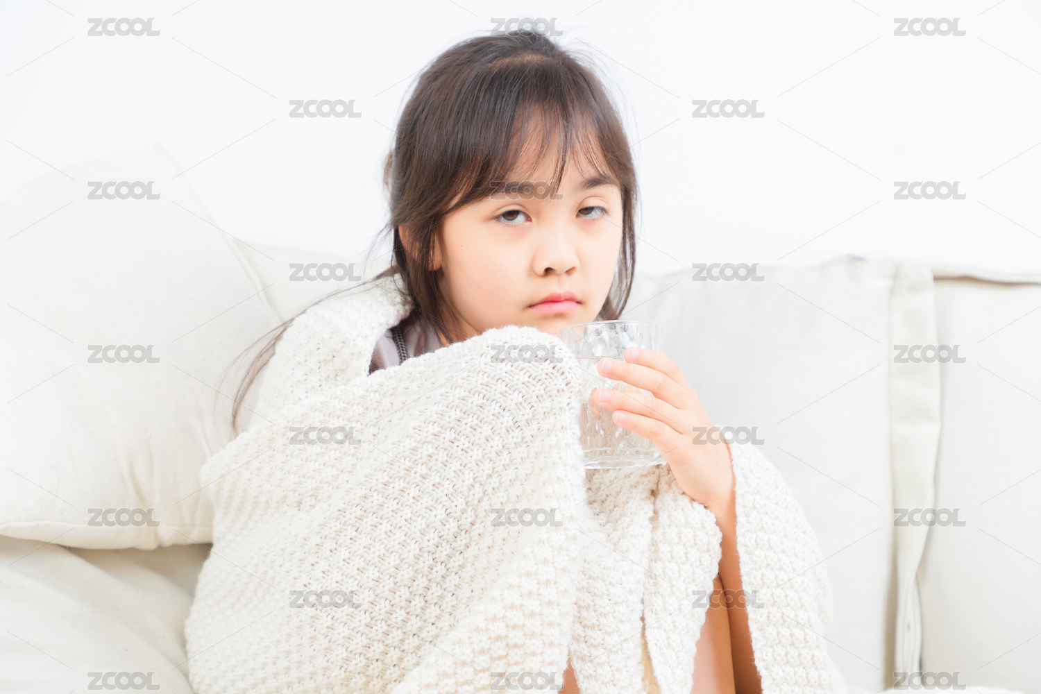 坐在沙发上的亚洲小女孩,身体感觉不舒服
