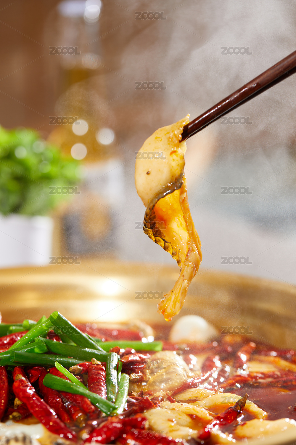 一盆美味的酸菜鱼和一双筷子夹起酸菜鱼肉片