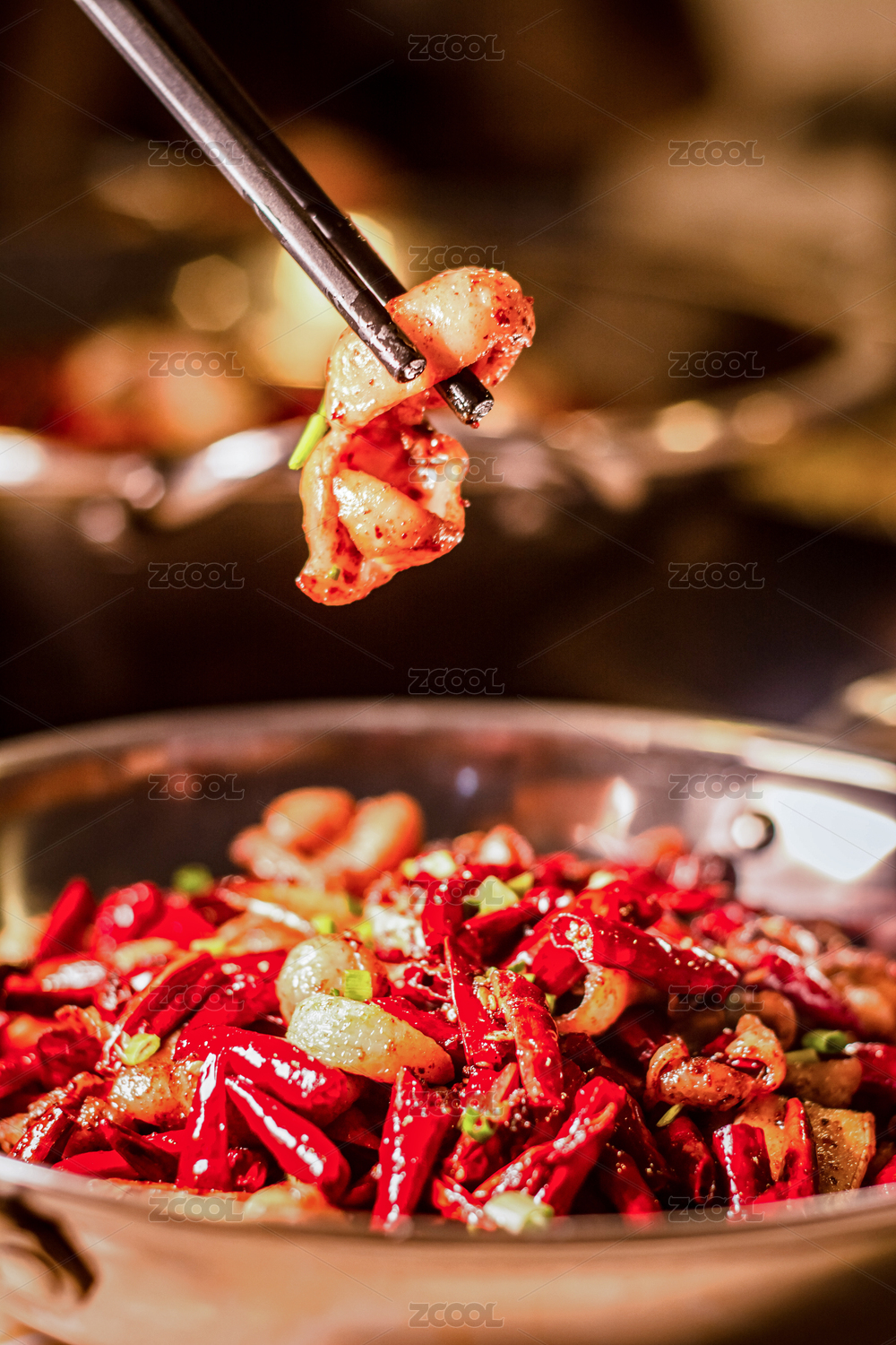 架子筷子上的成都名小吃麻辣油泼水煮鱼