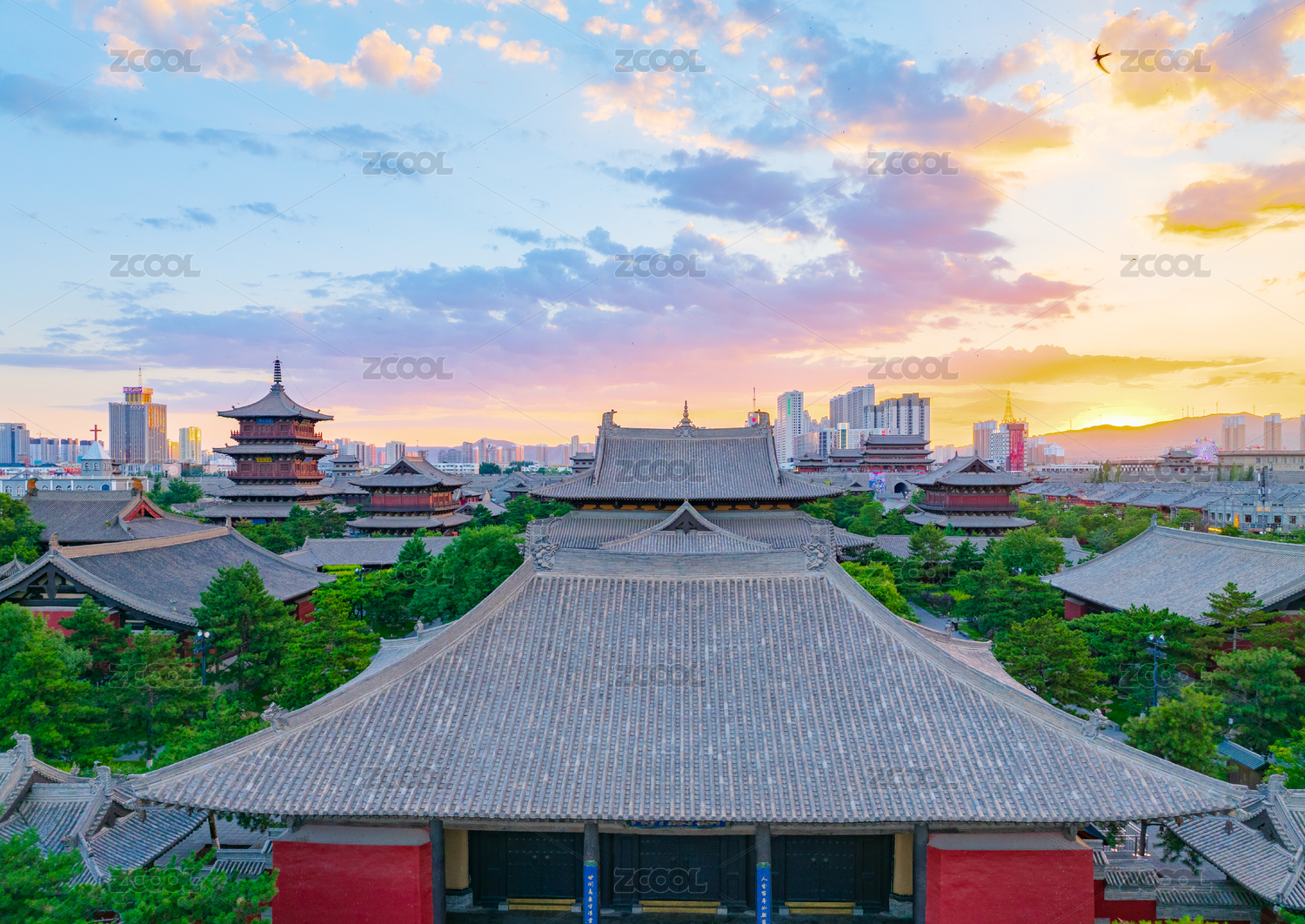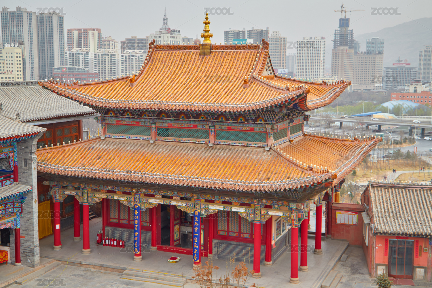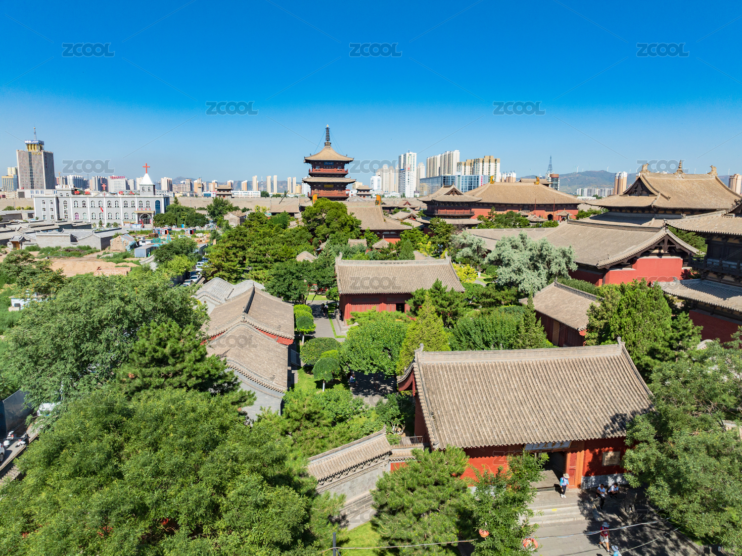 中国内蒙古呼和浩特大召寺和远处的高楼建筑