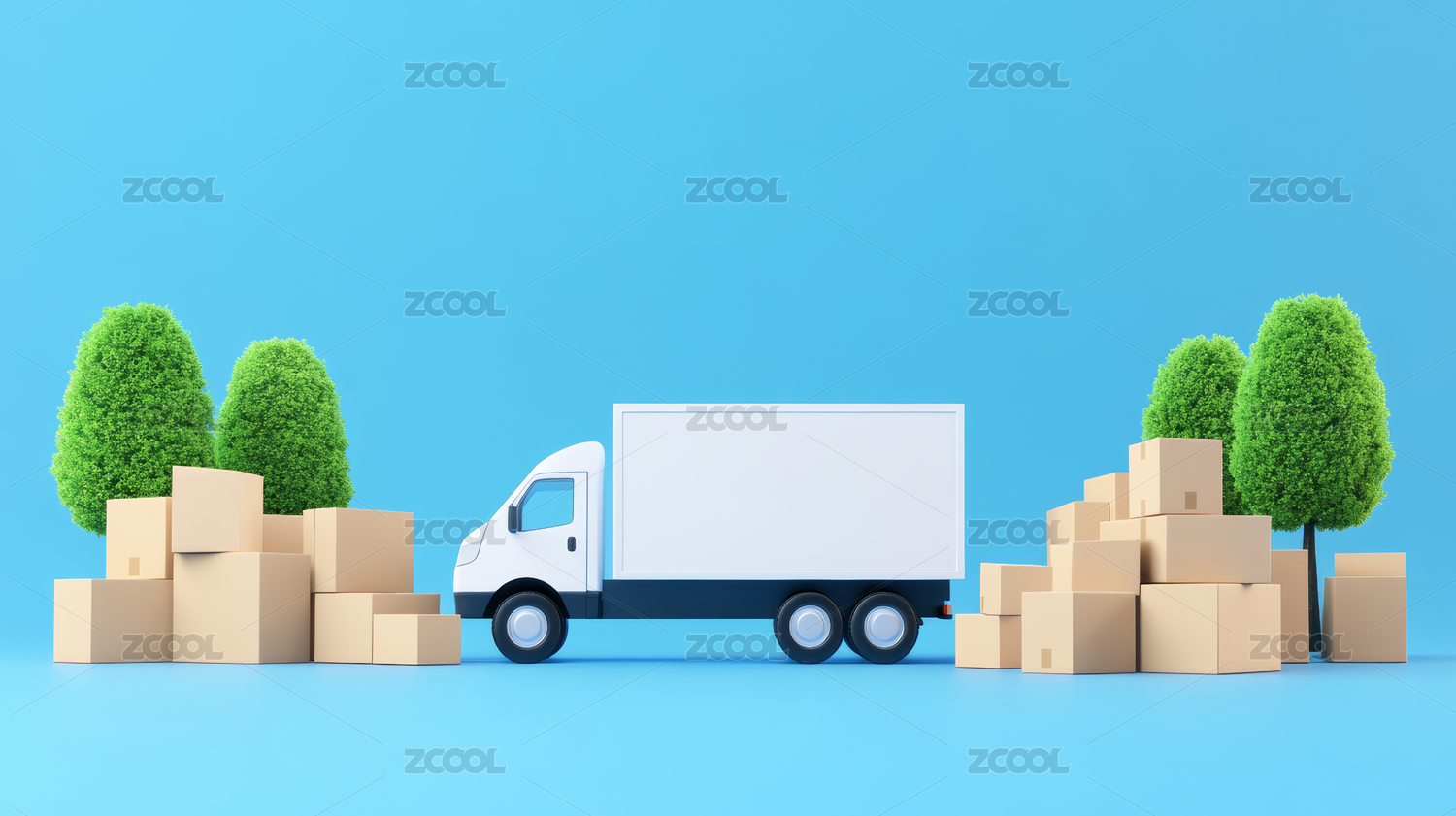 三维卡通插画白色卡车与快递纸箱蓝色背景
