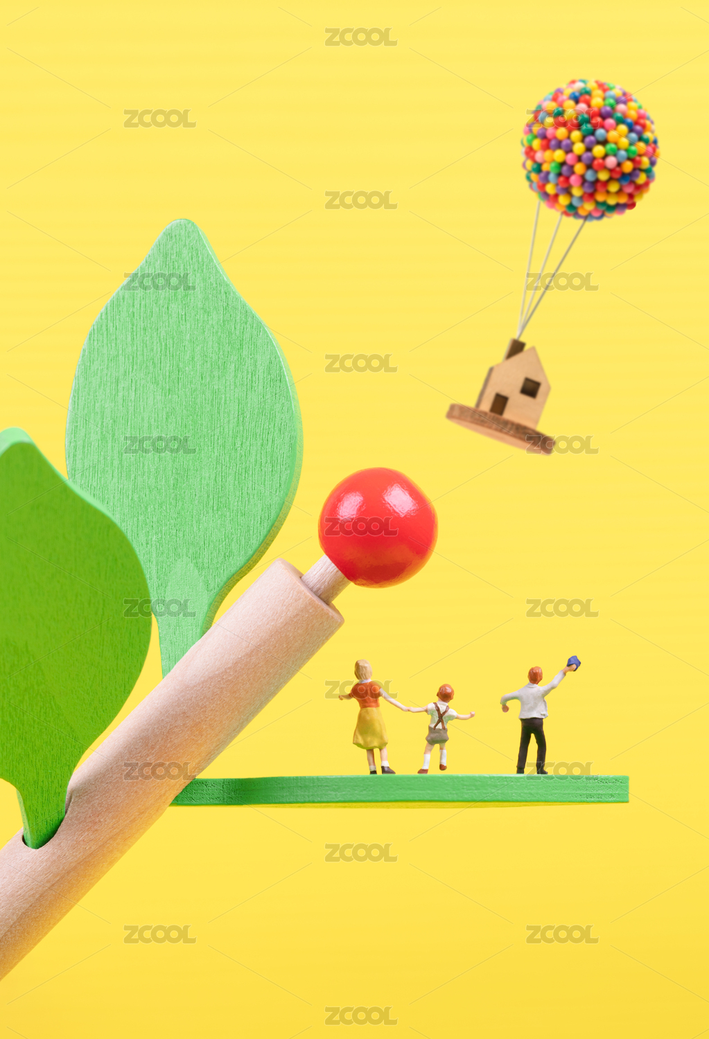 微缩创意积木红果叶子上欢呼的三孩儿童气球
