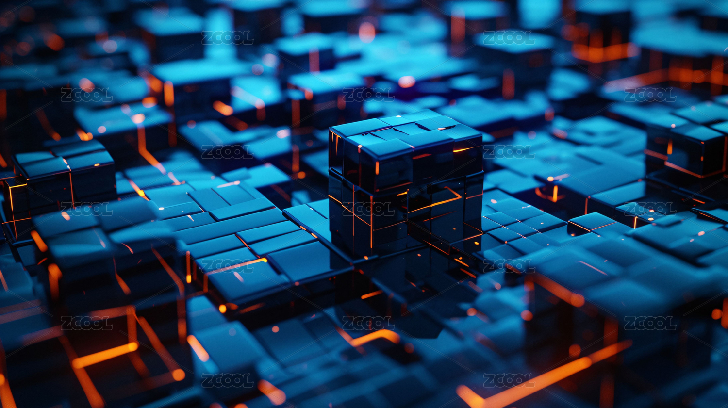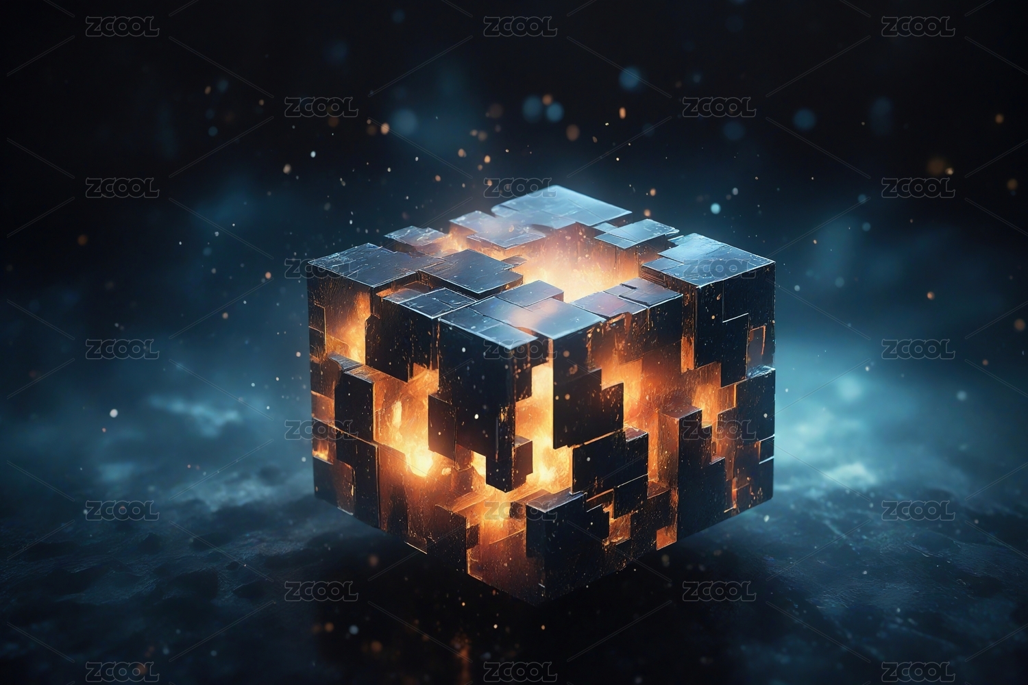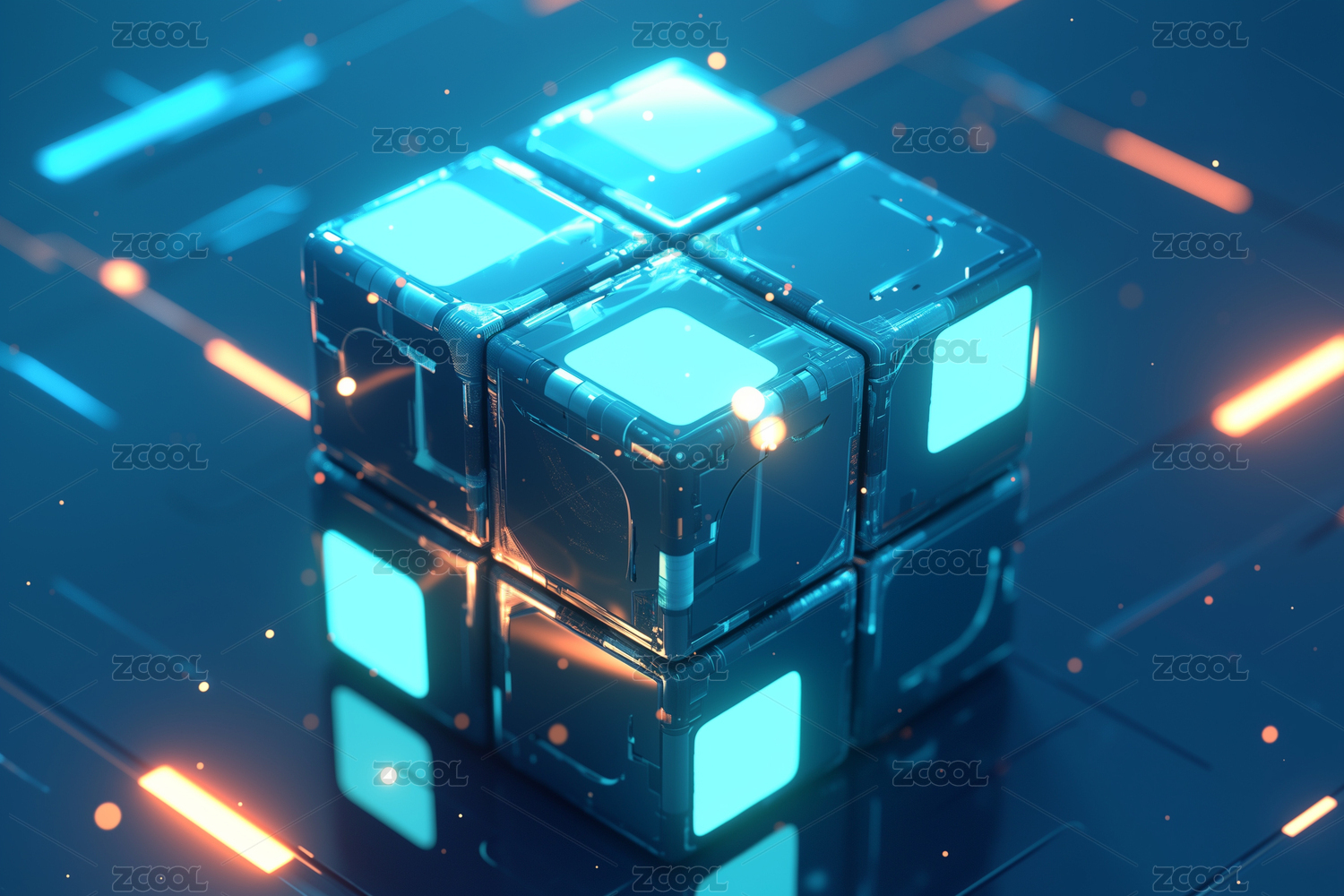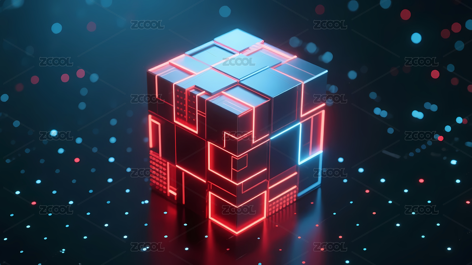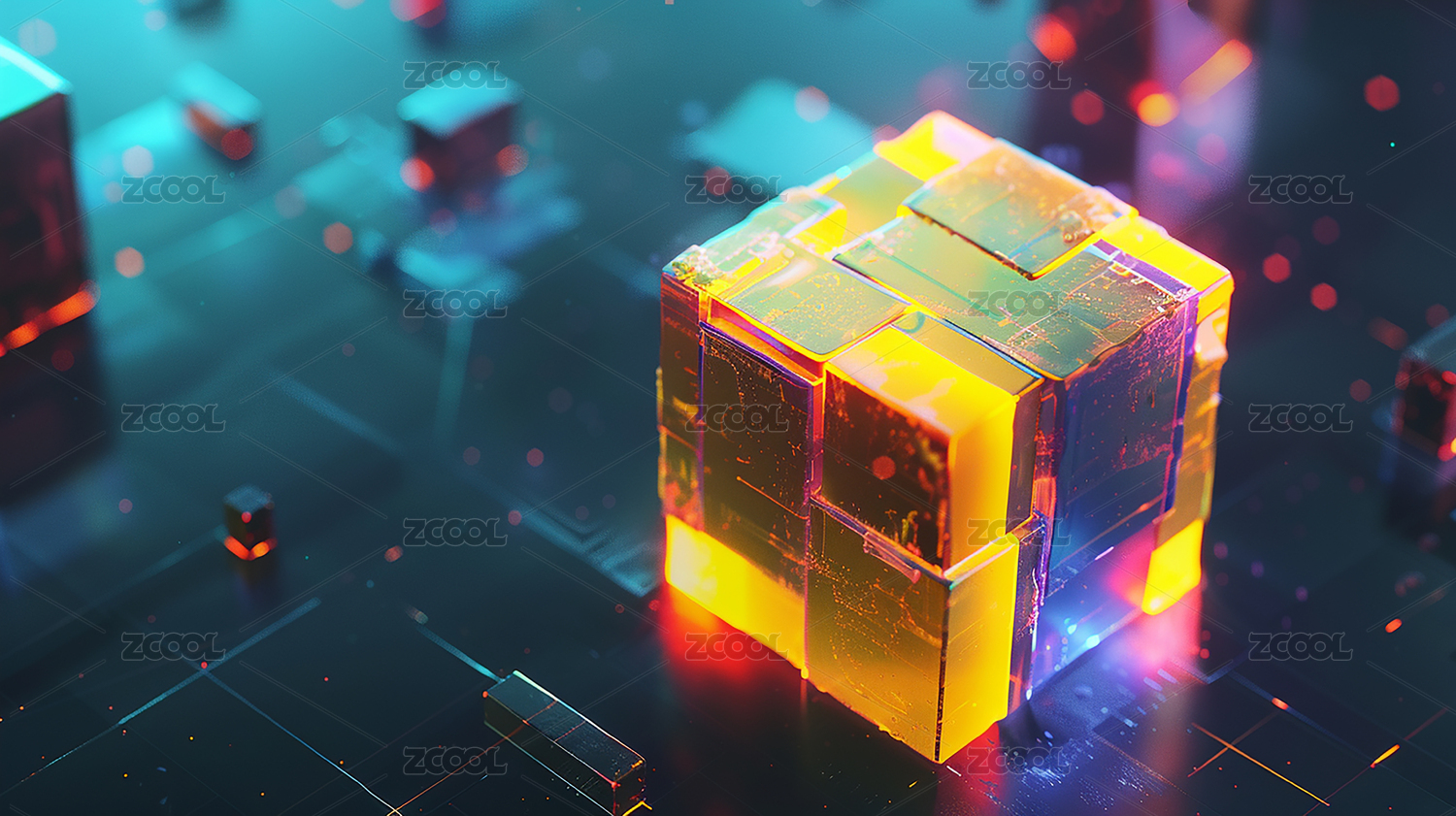科幻彩色赛博荧光色魔方CPU存储3D插画