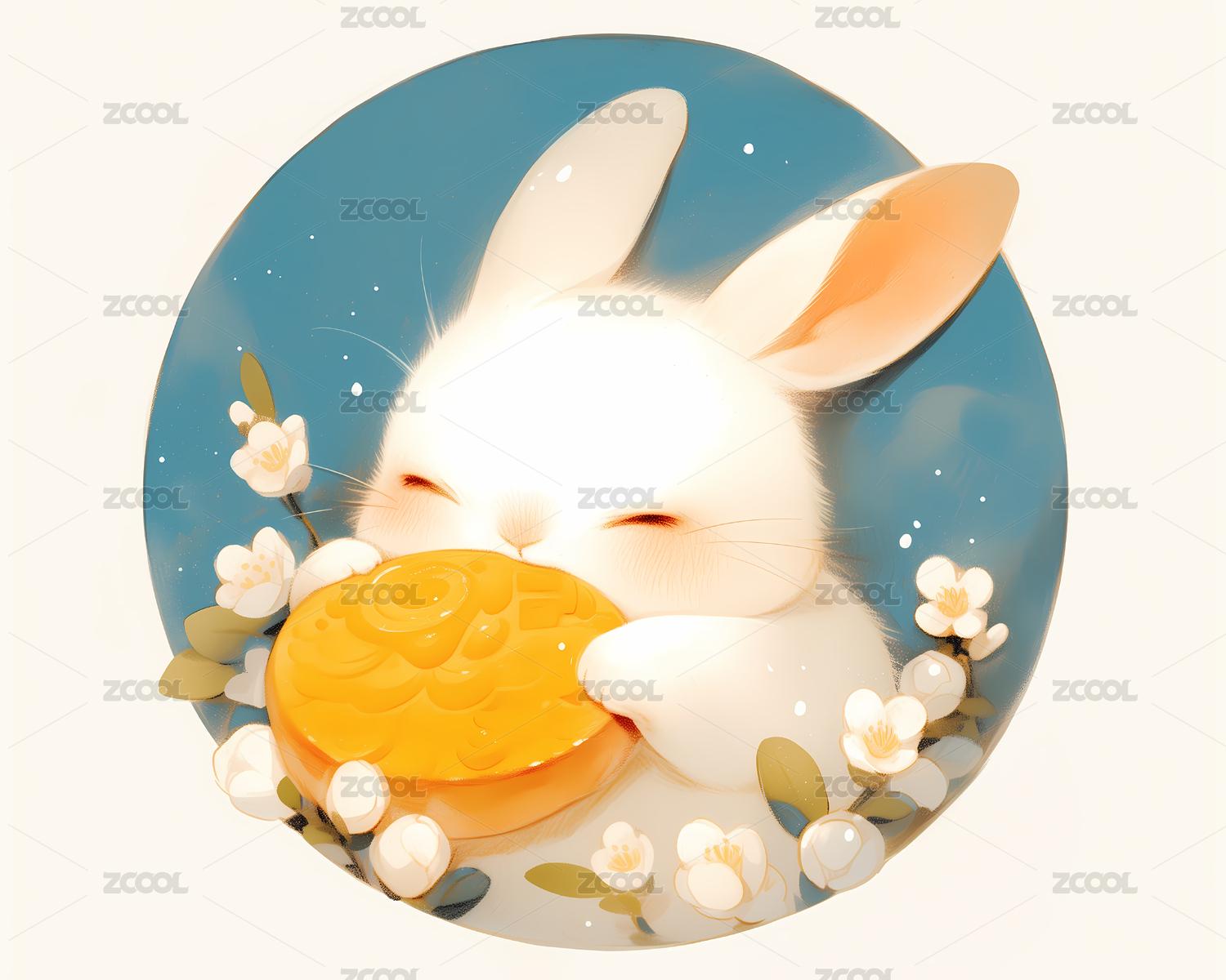 中秋节一只可爱白兔月饼茉莉花水彩插画