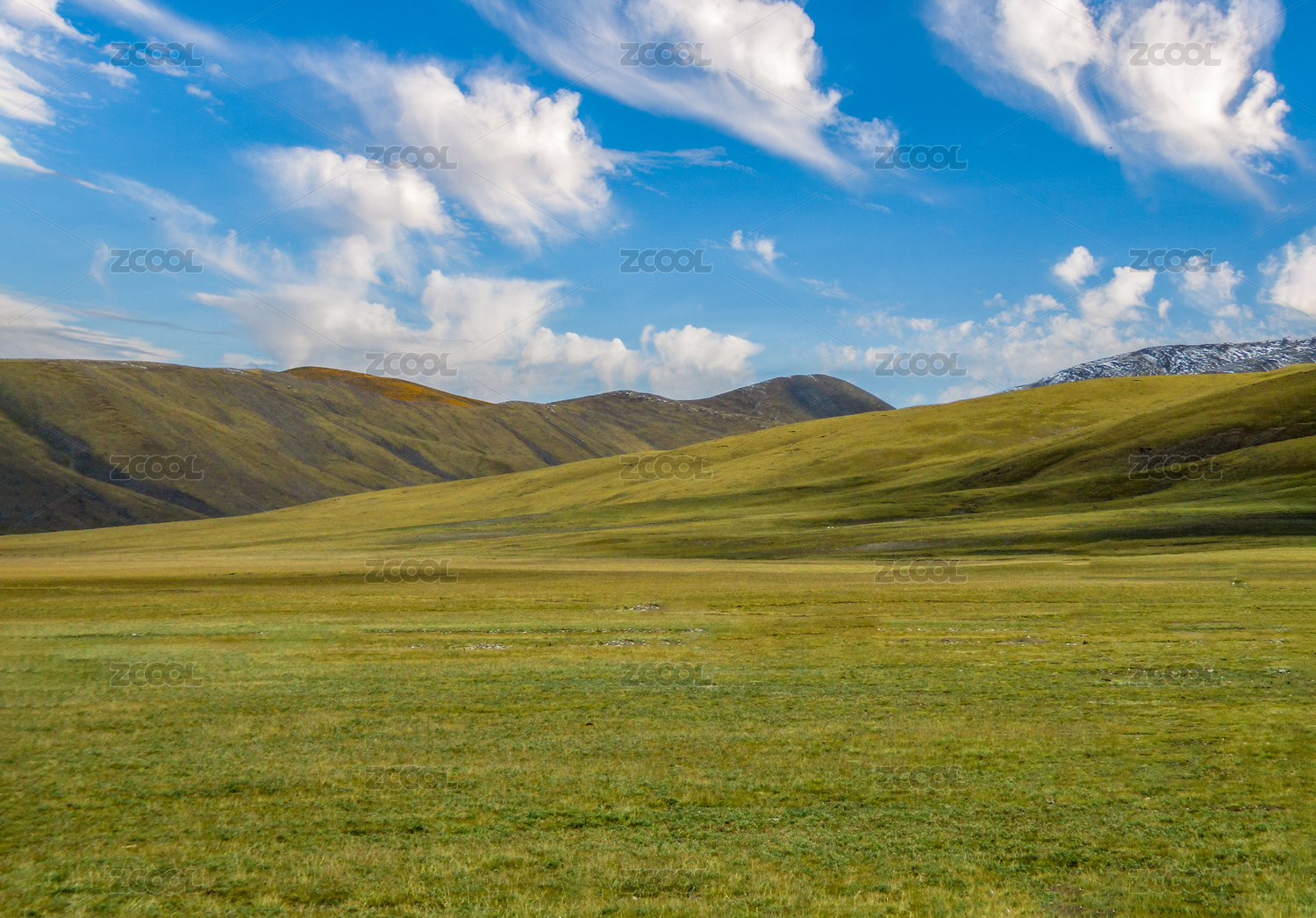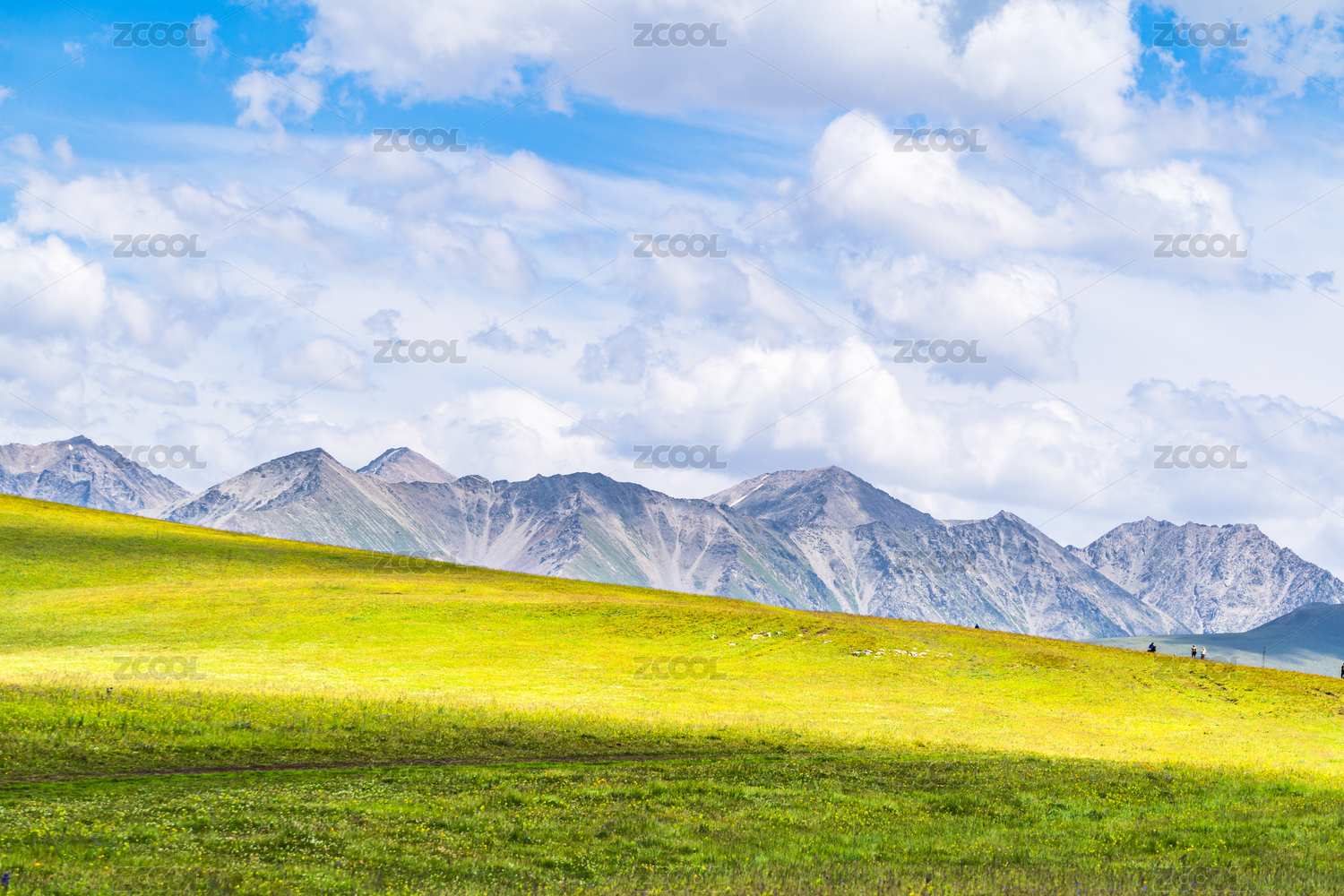 中国新疆夏季蓝天白云下G217独库公路沿途高山草原