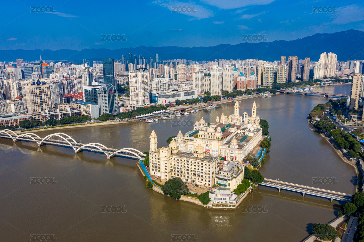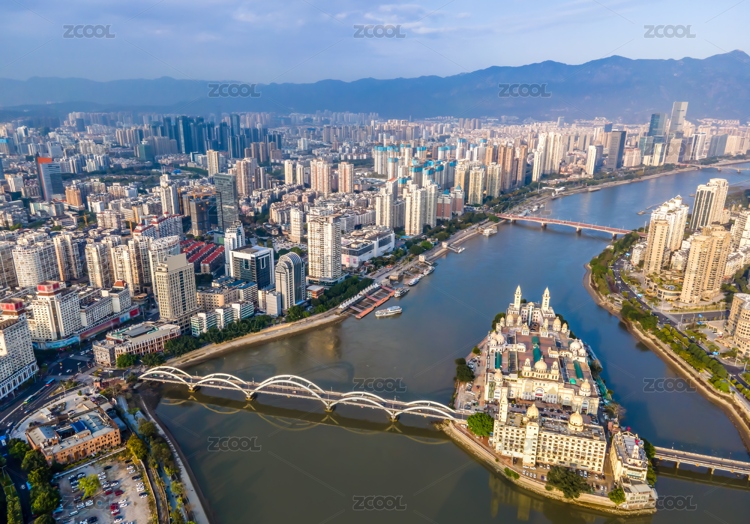 航拍福建福州中洲岛及解放大桥欧式建筑岛屿